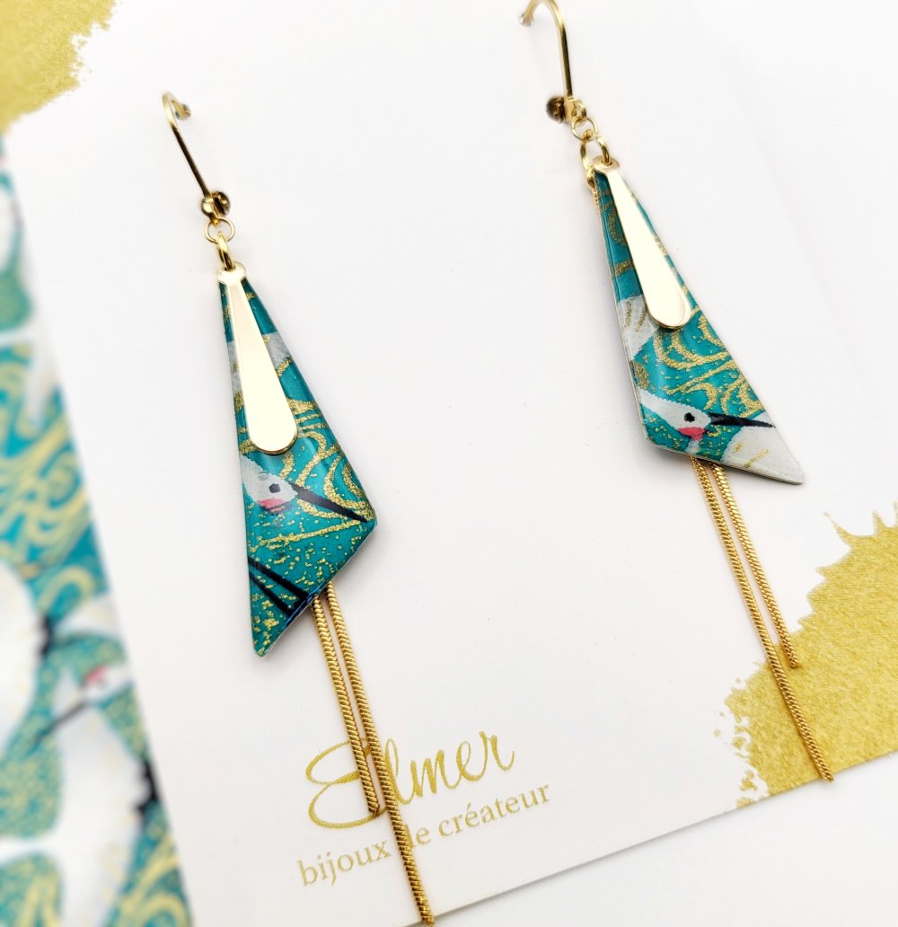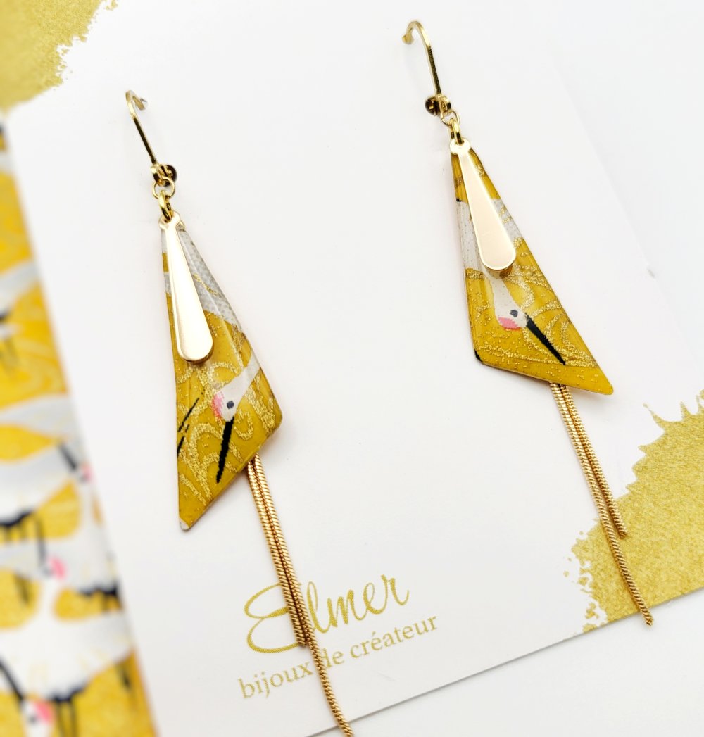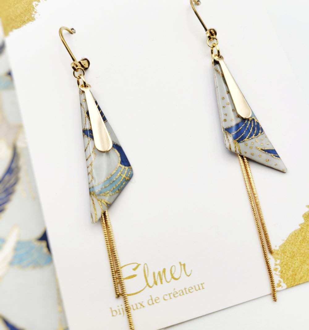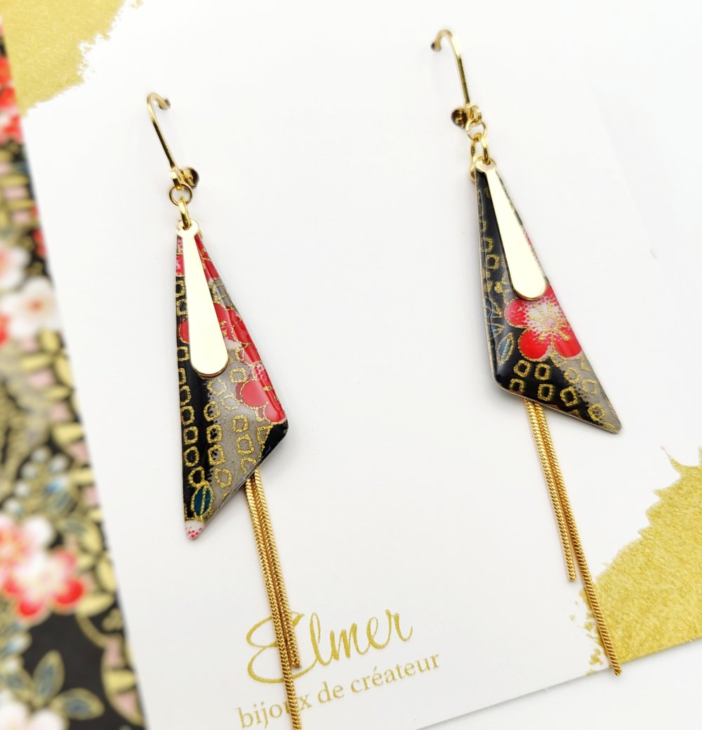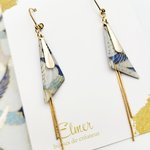 Elles associent une pampille triangulaire en papier washi japonais, protégée par une fine résine, à une pampille dorée allongée prolongée de fines chaînes pendantes.
