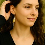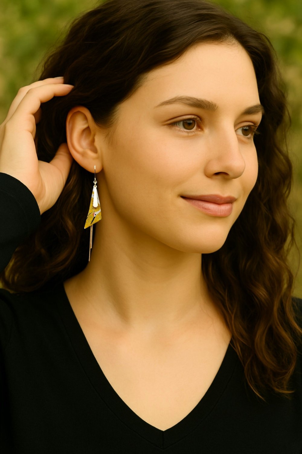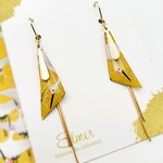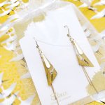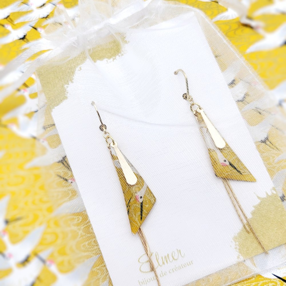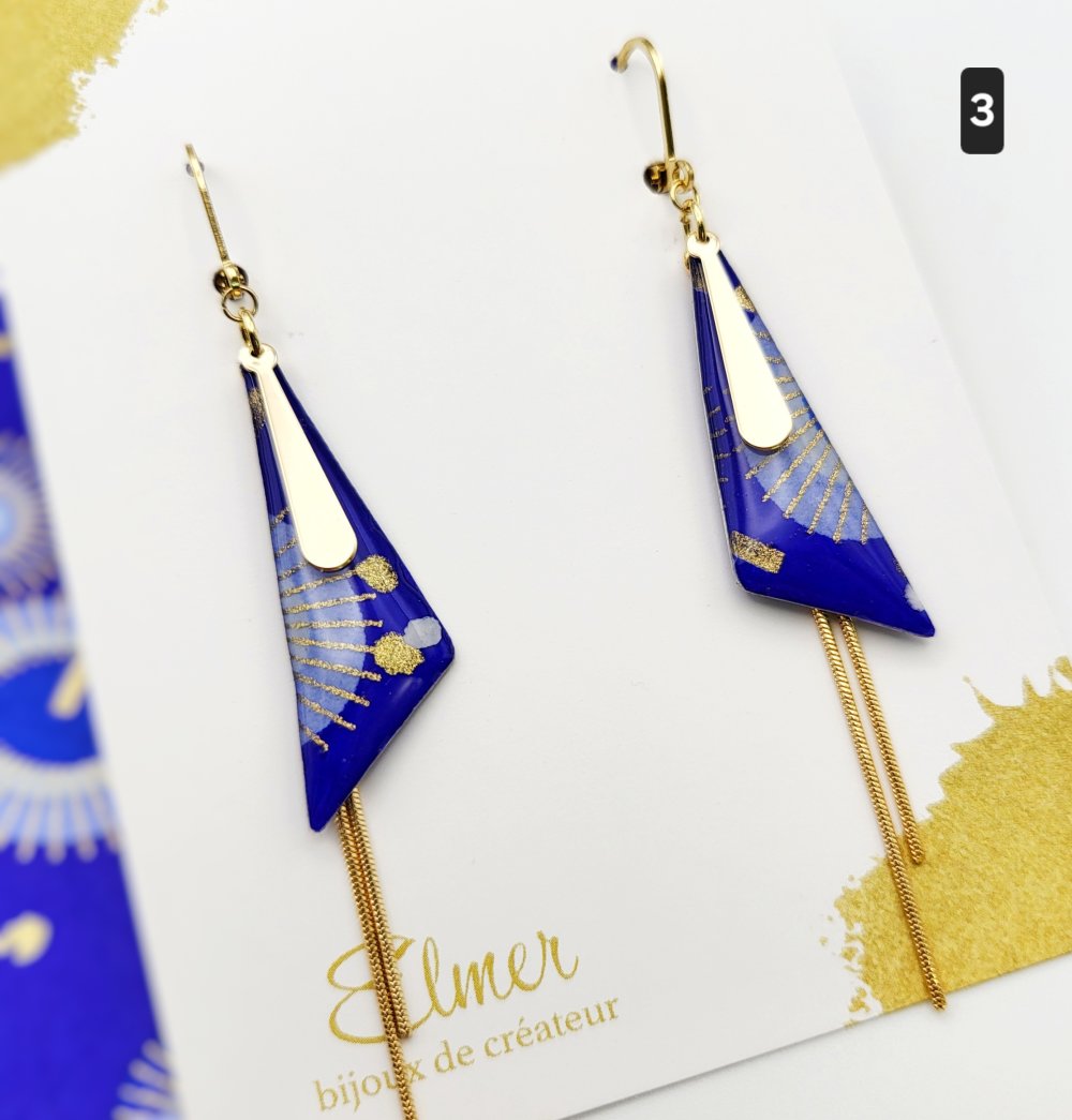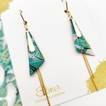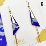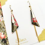 Elles associent une pampille triangulaire en papier washi japonais, protégée par une fine résine, à une pampille dorée allongée prolongée de fines chaînes pendantes.