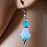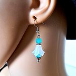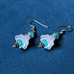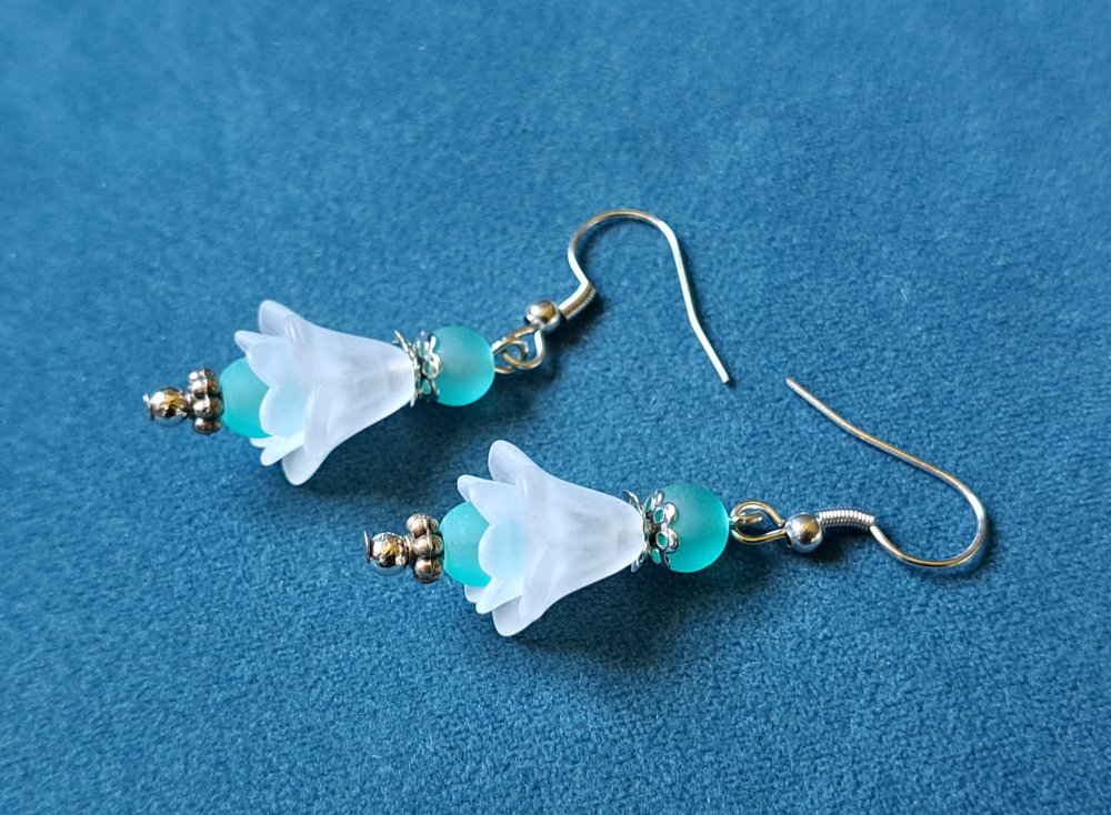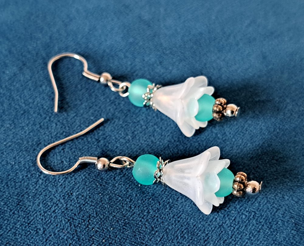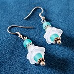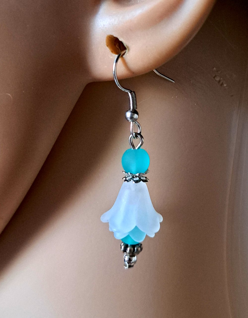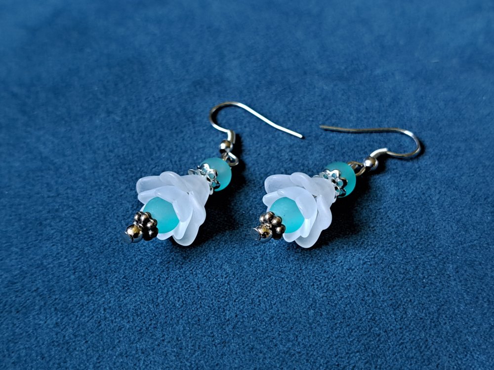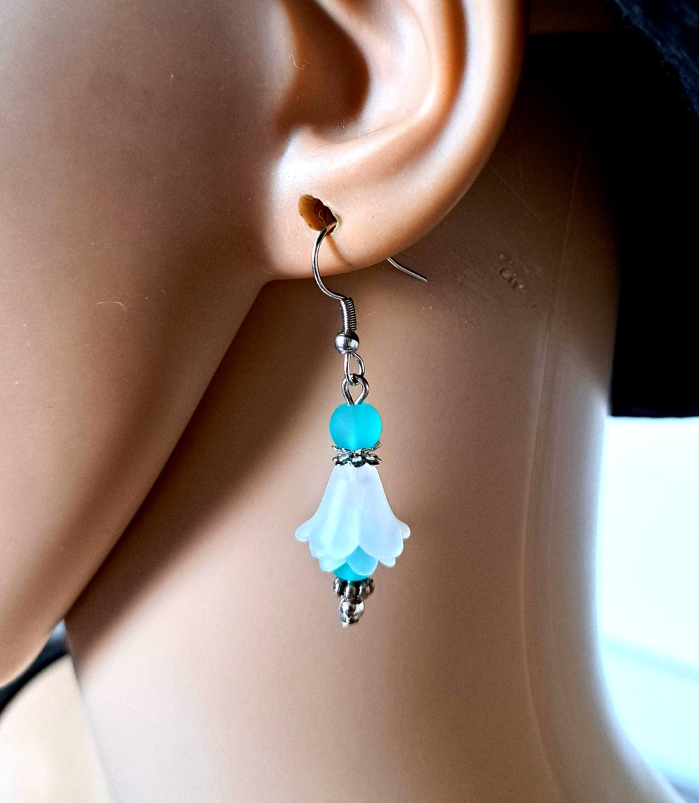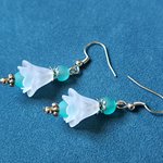 boucle d'oreille cloche acrylique blanche, perles bleu, crochets en métal acier Inoxydable argenté