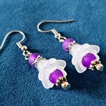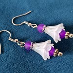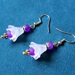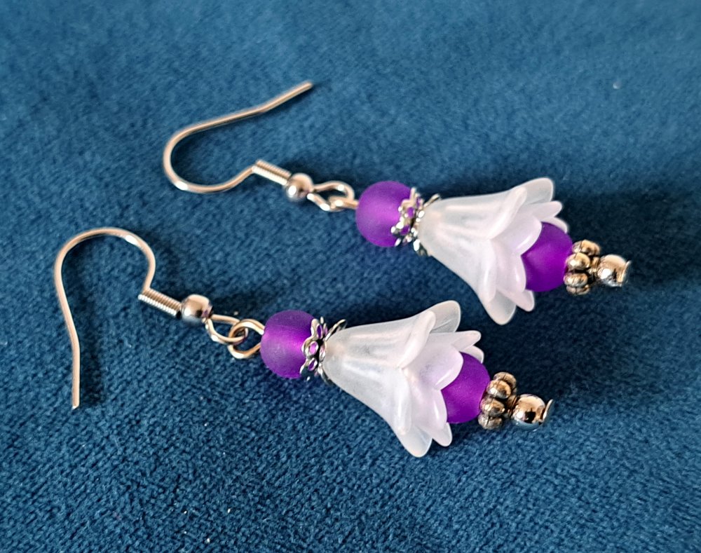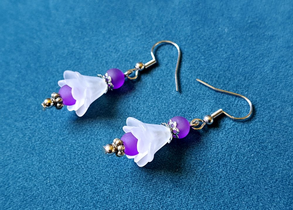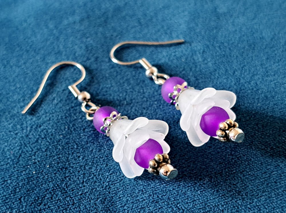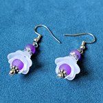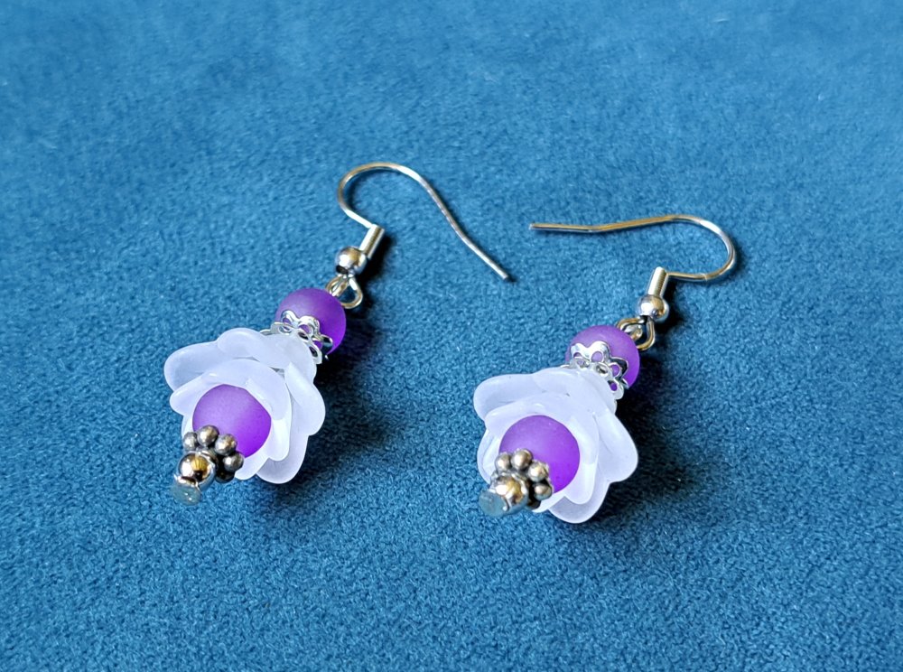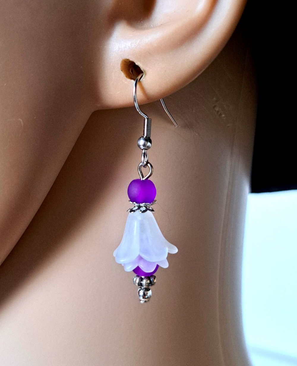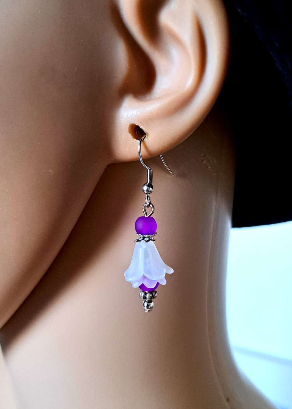 boucle d'oreille cloche acrylique blanche, perles violette, crochets en métal acier Inoxydable