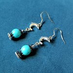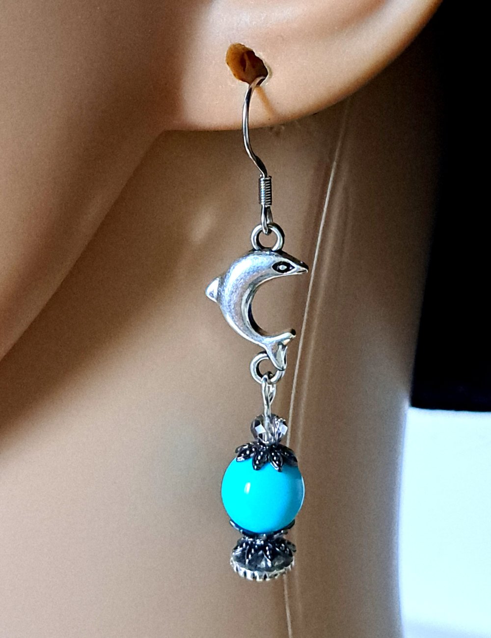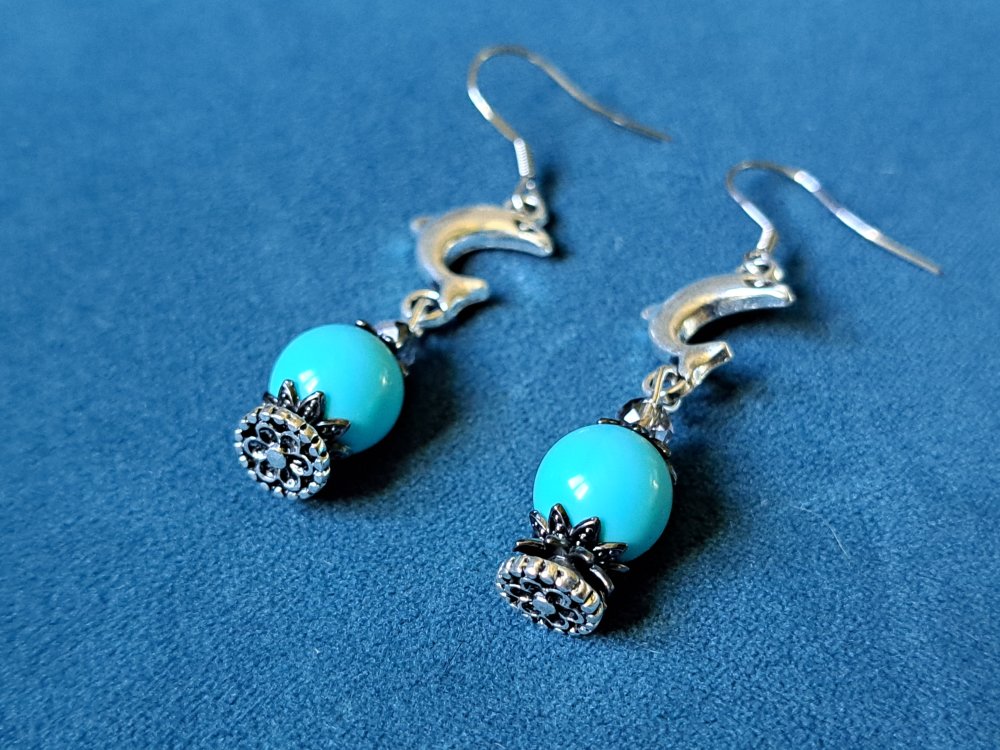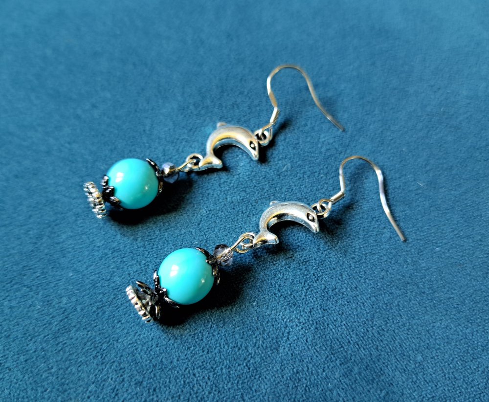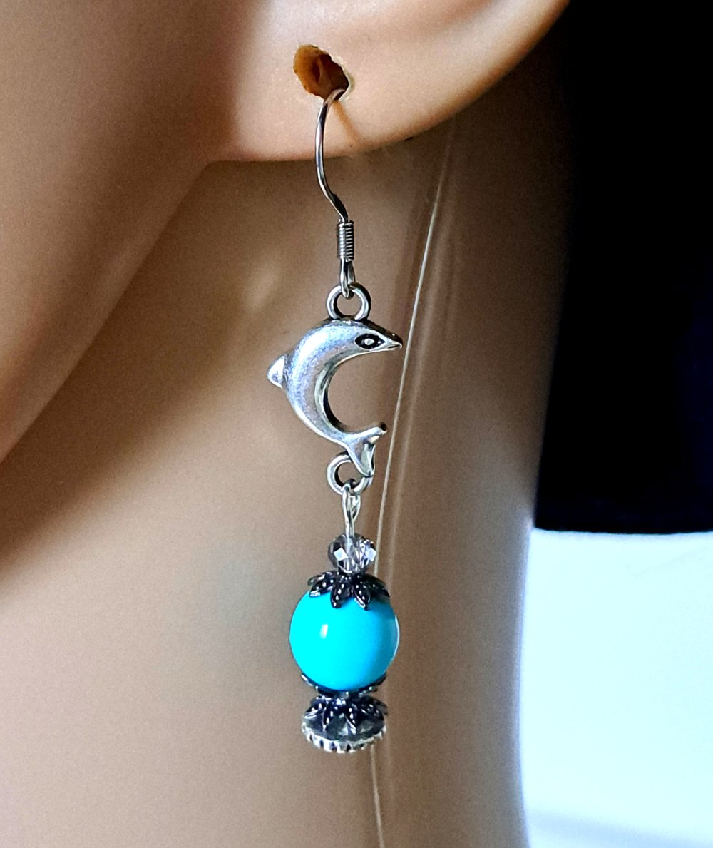 boucle d'oreille dauphin, perles en acrylique bleu, crochets en métal acier Inoxydable argenté