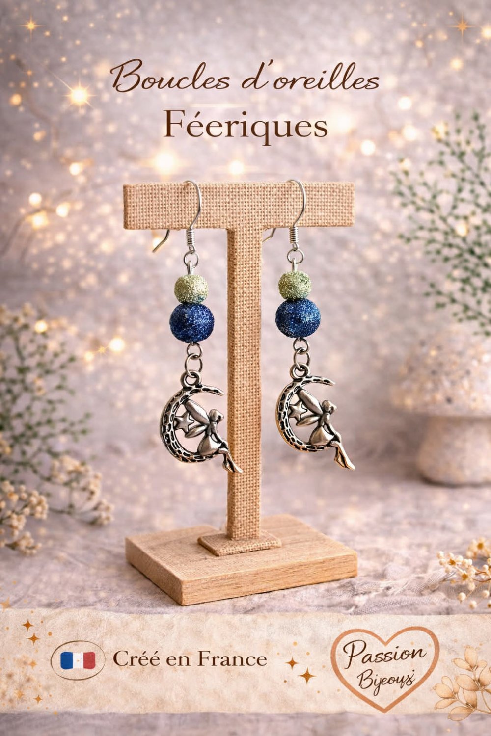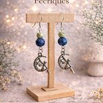 Voici une jolie paire de boucle d'oreille fantaisie fée, avec des perles vert et bleu nuit accompagné d'une breloque fée argenté.