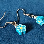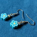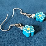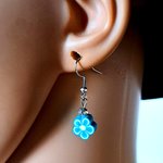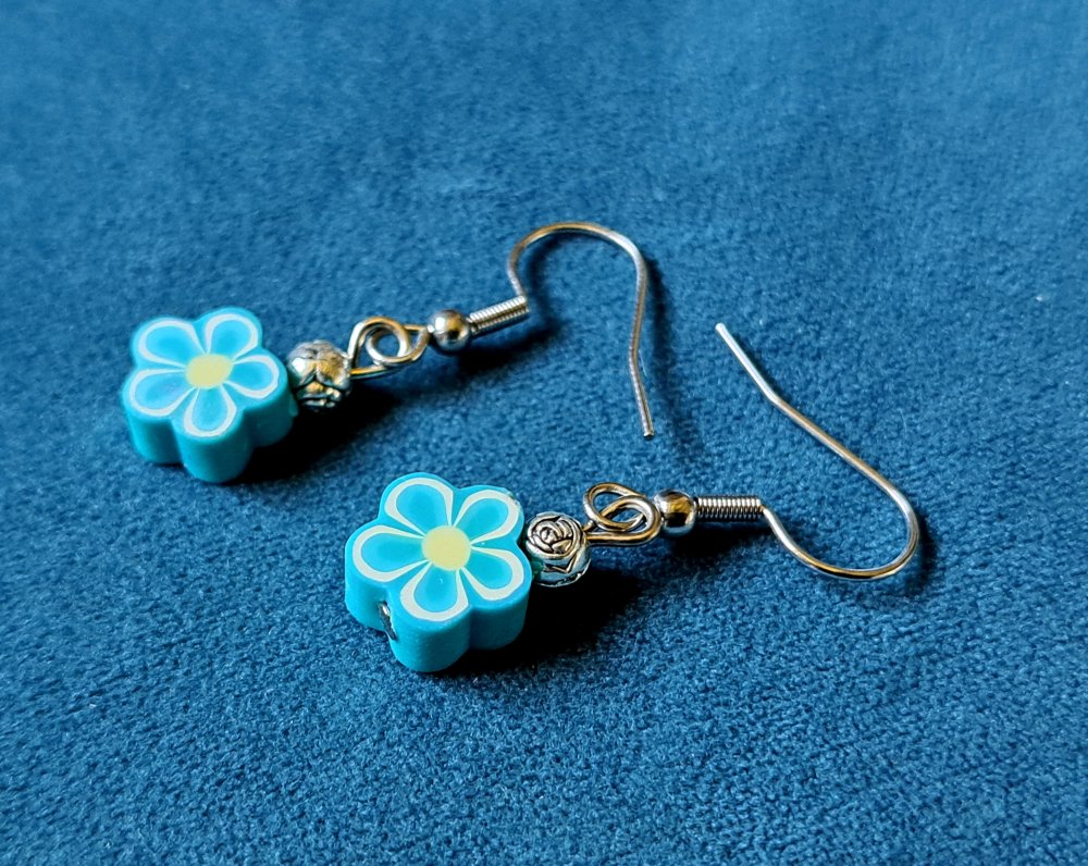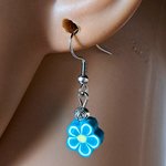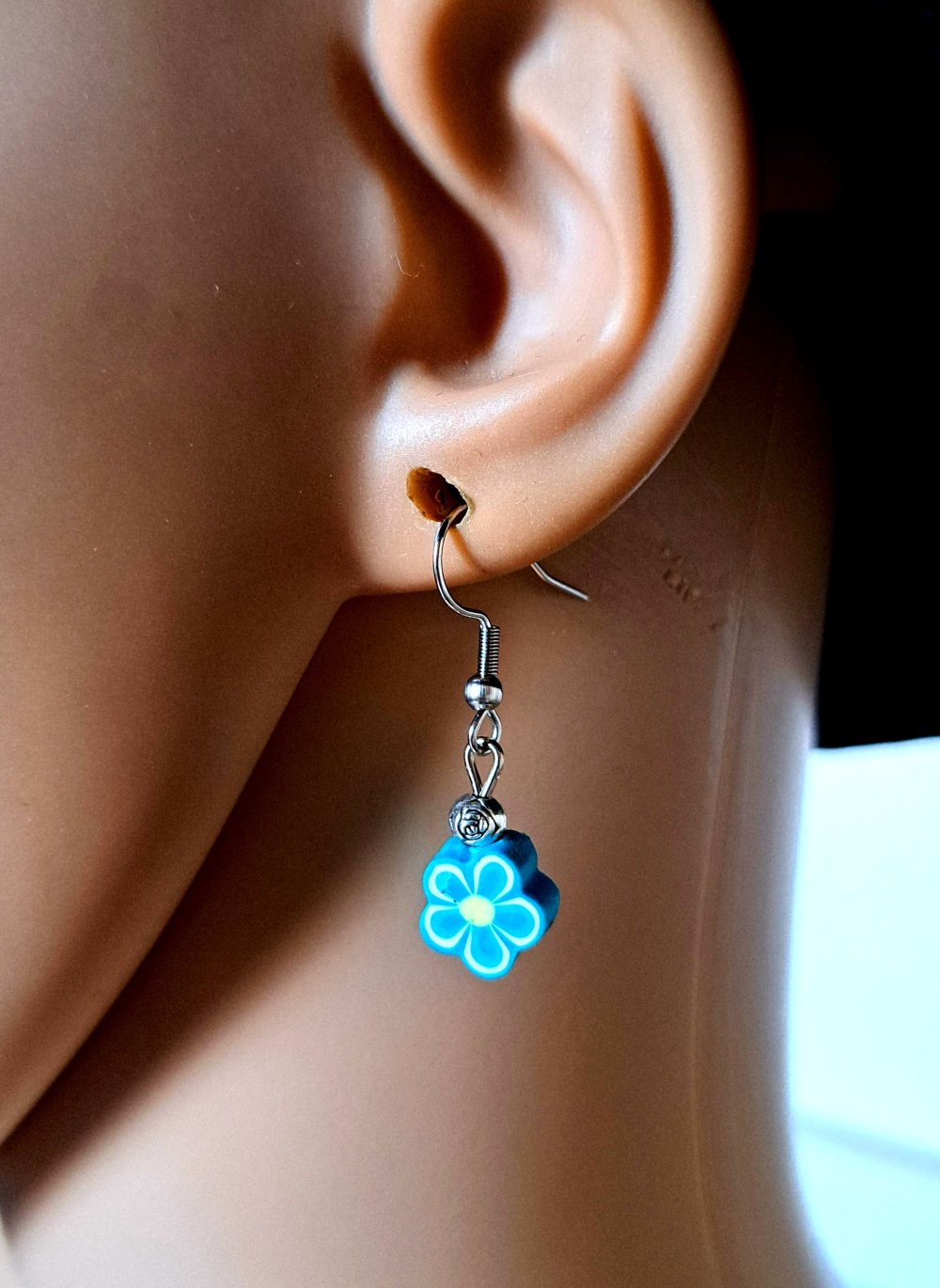 boucle d'oreille fleur acrylique bleu, jaune, perles, crochets en métal acier Inoxydable argenté