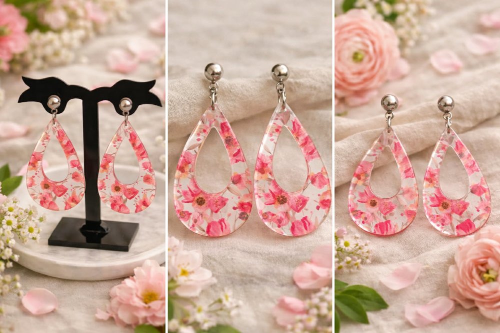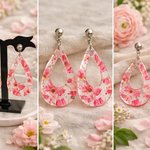 Pendentif goutte évidée en acrylique transparent avec un imprimé fleurs rose devant , 49x32 mm.