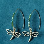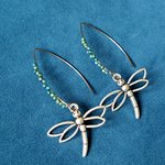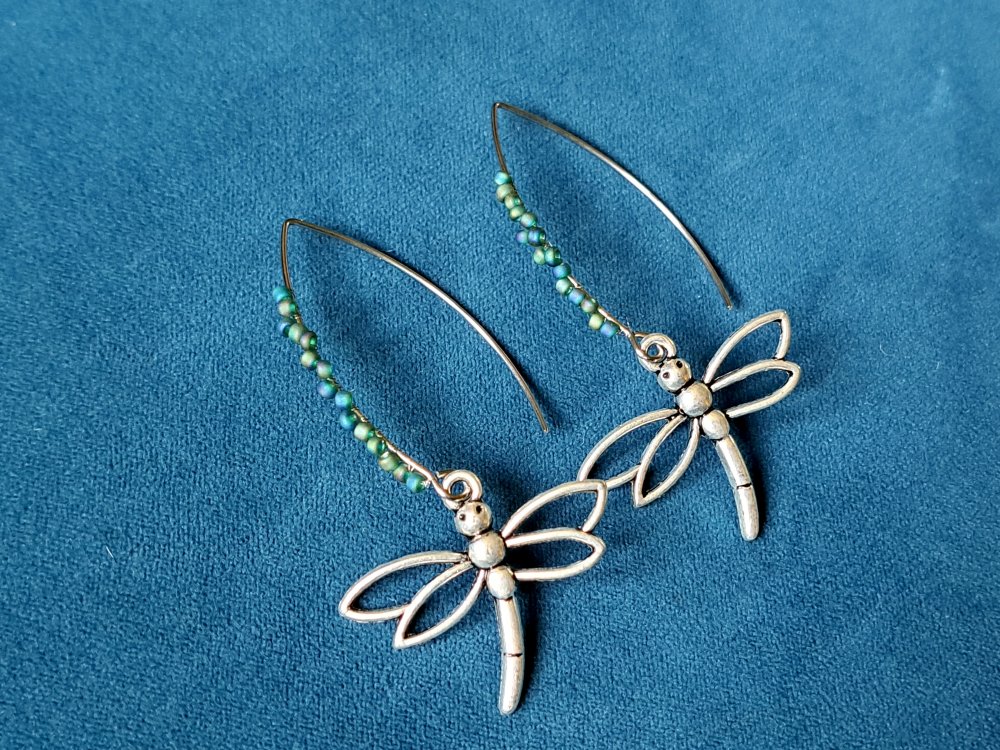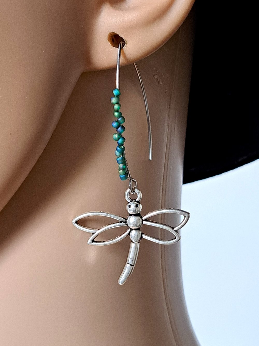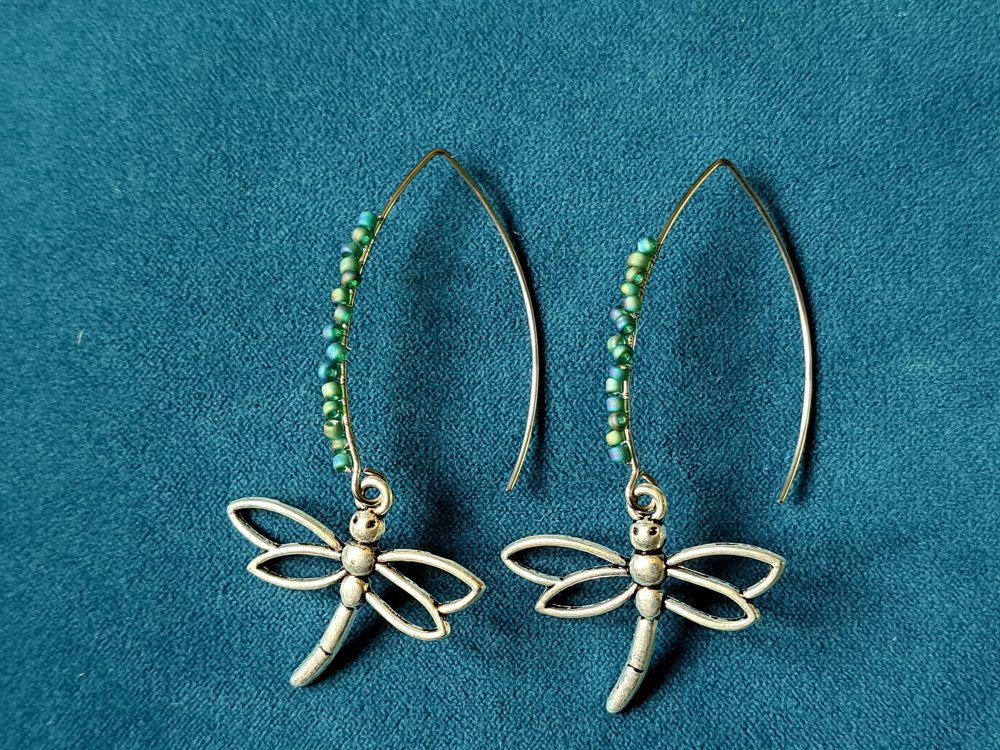 boucle d'oreille libellule, perles en rocaille en verre verte, crochets en métal acier Inoxydable argenté
