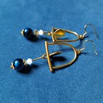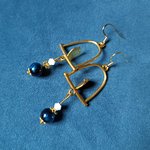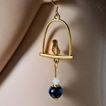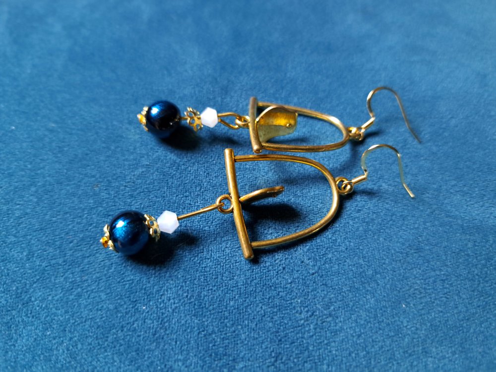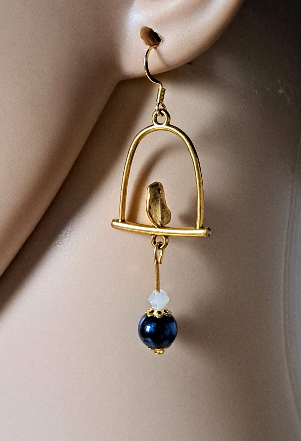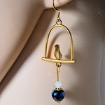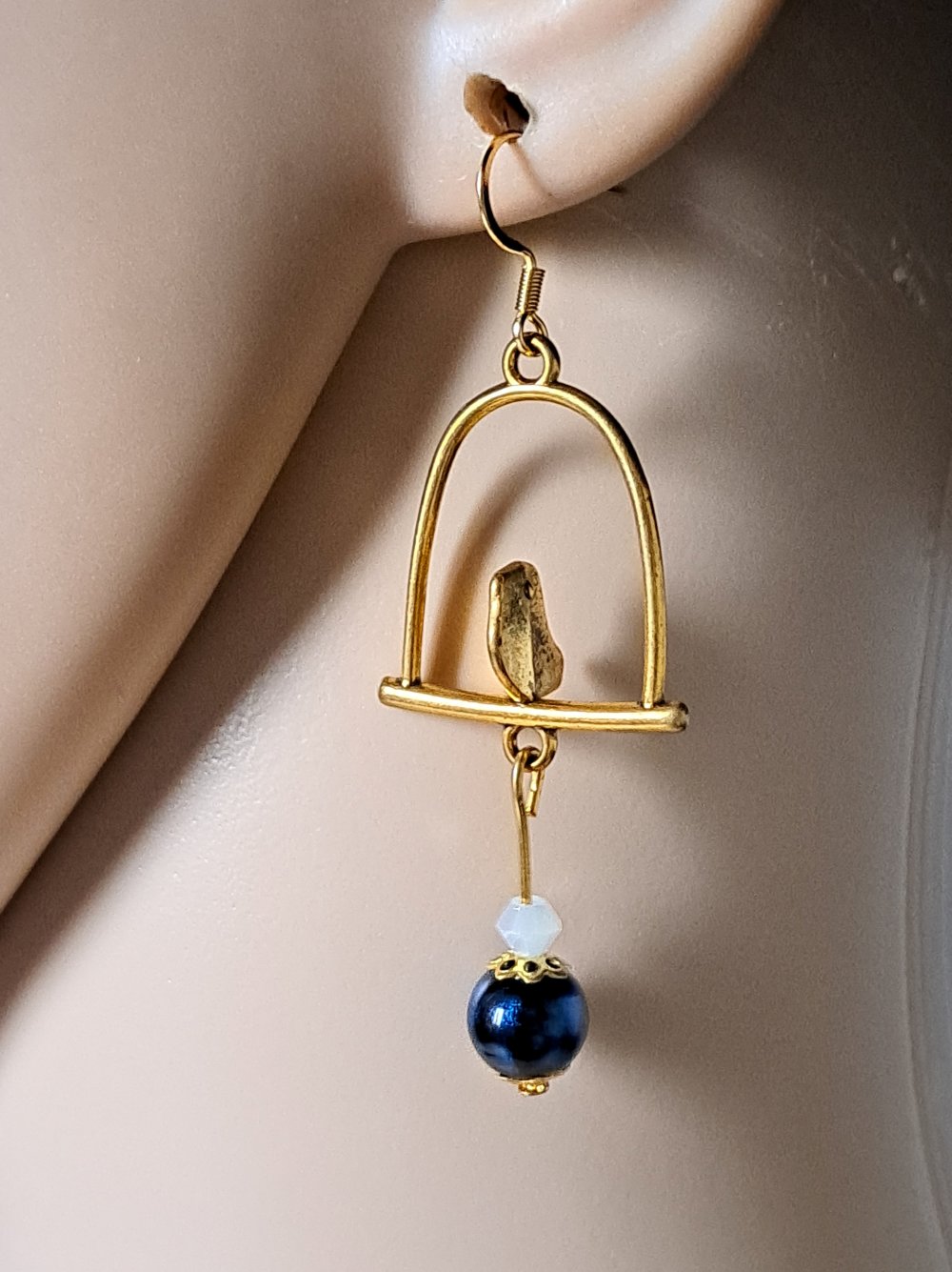 boucle d'oreille oiseaux, perles en verre bleu foncé , blanc, crochet en métal acier Inoxydable doré ancien
