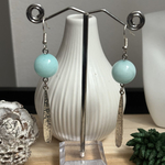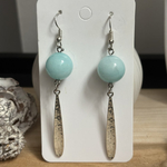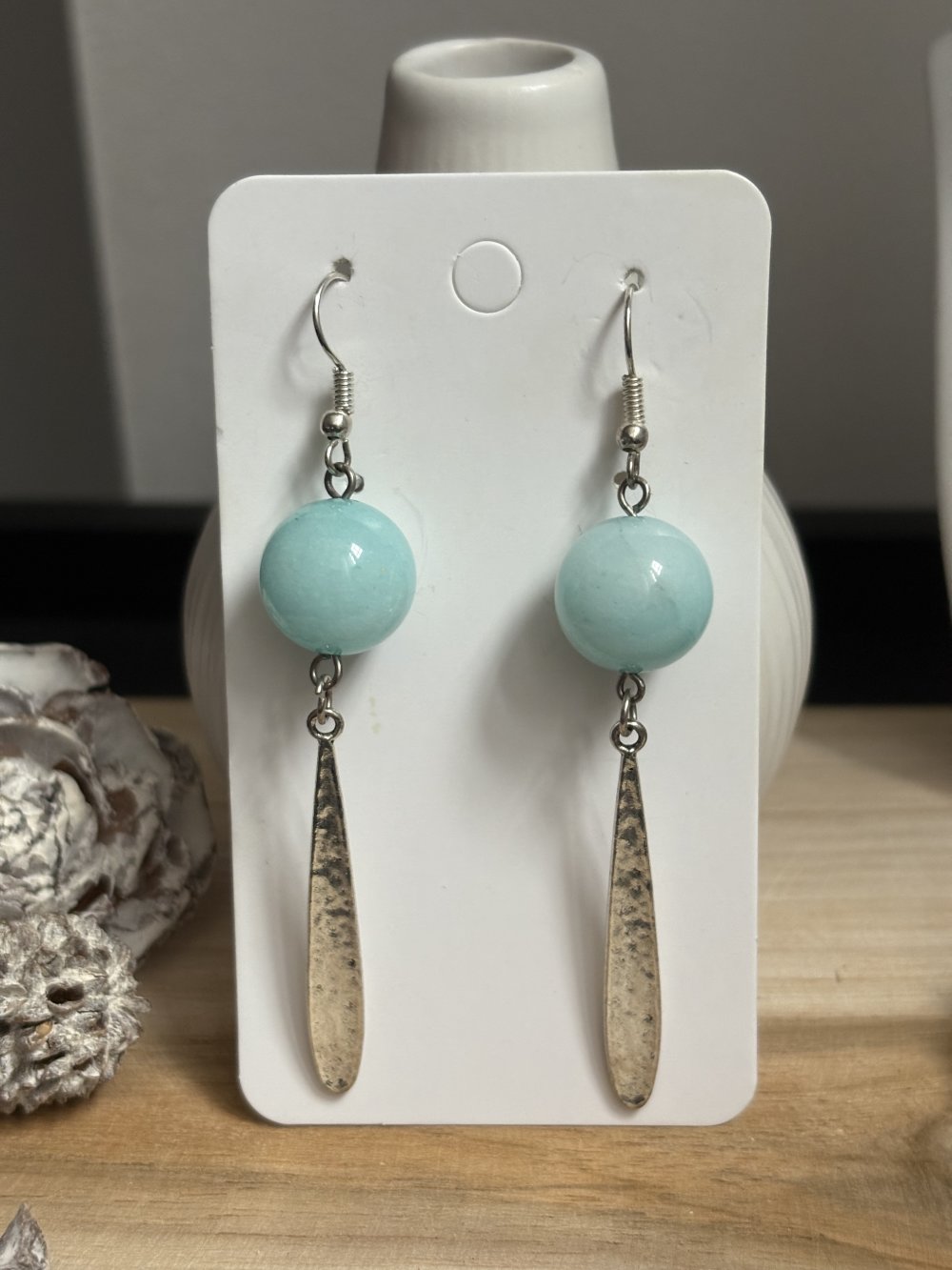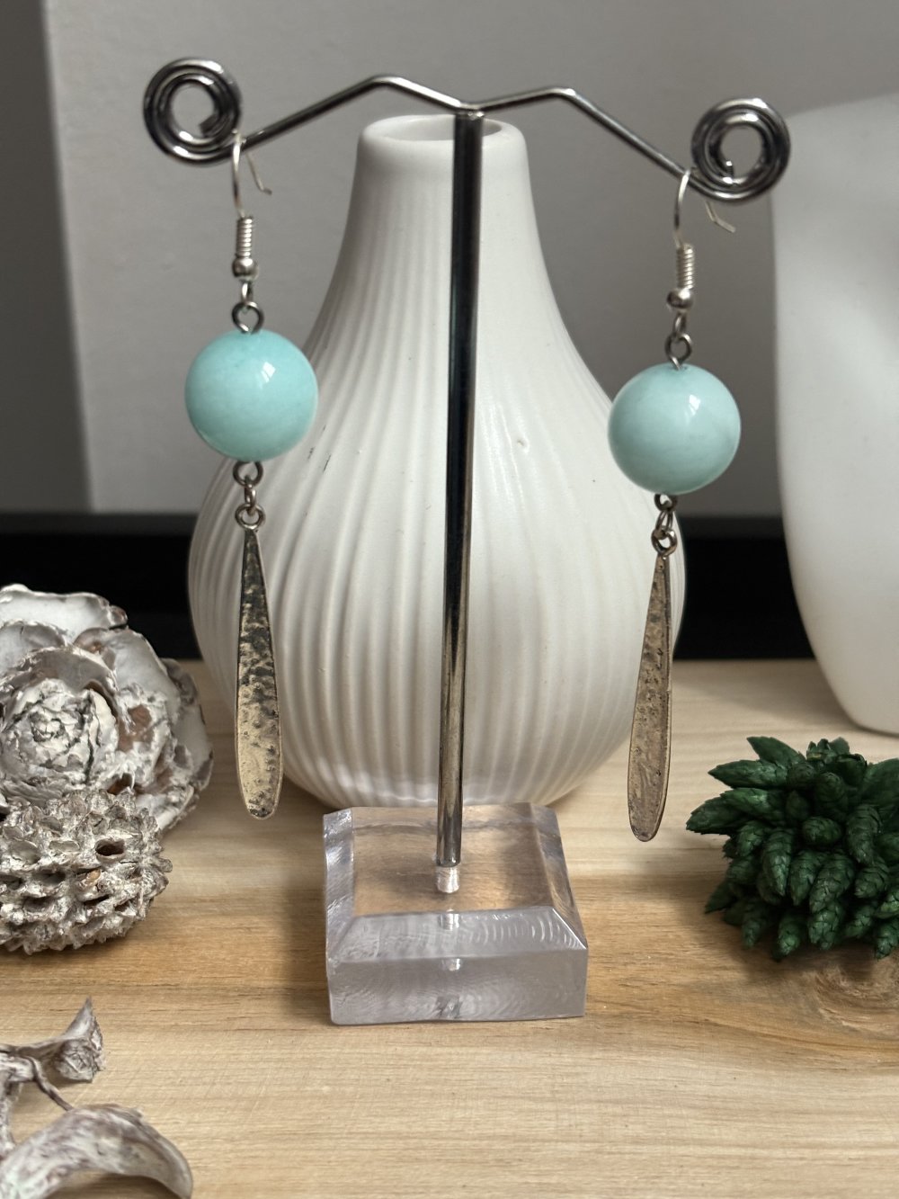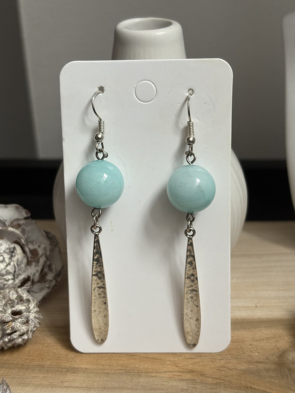 boucles d'oreille pendante goutte jade turquoise 10 mm avec un goutte argenté martelé