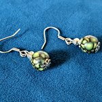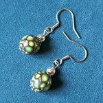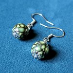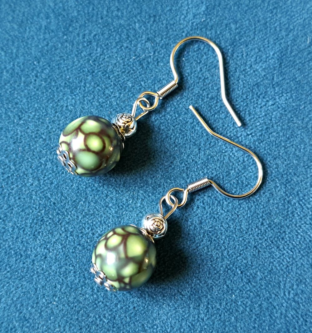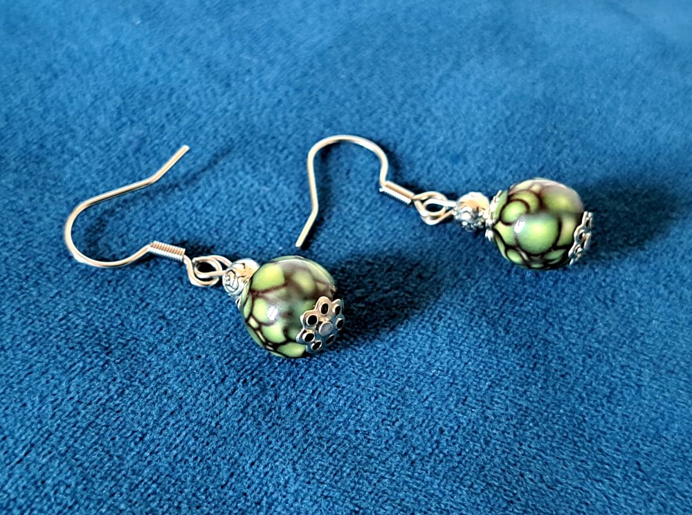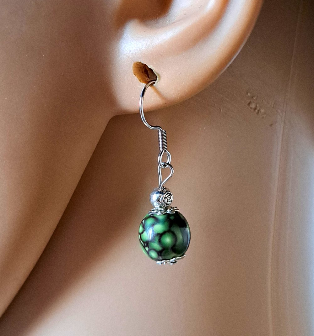 boucle d'oreille perles acrylique, vert marbré noire, crochets en métal acier Inoxydable argenté
