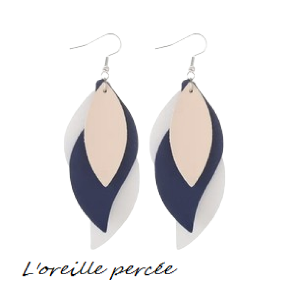 Boucle d'oreille trio de feuille blanche/bleu marine et beige
