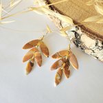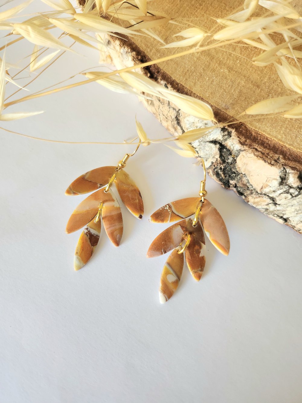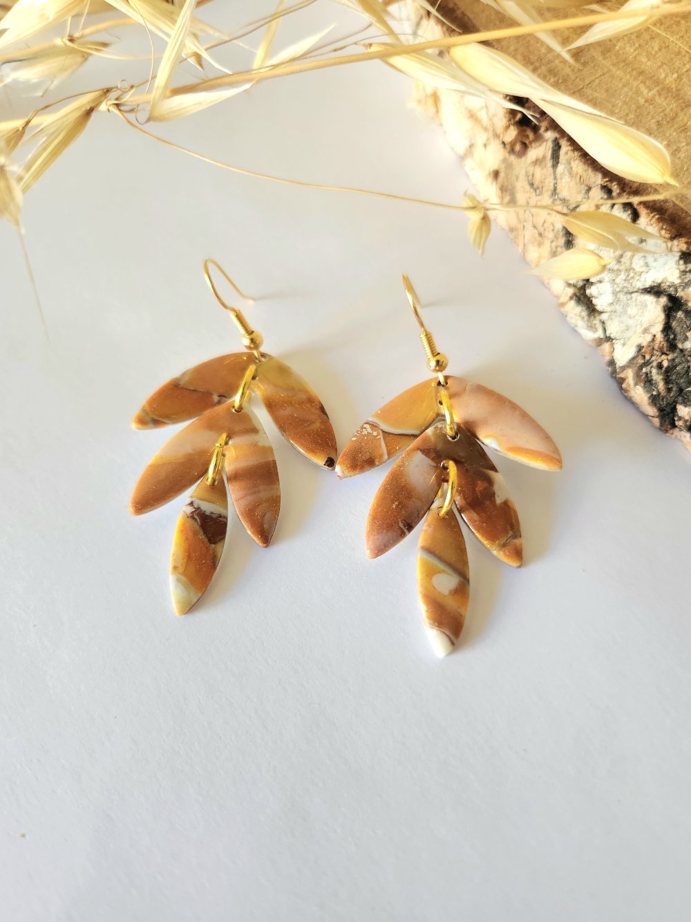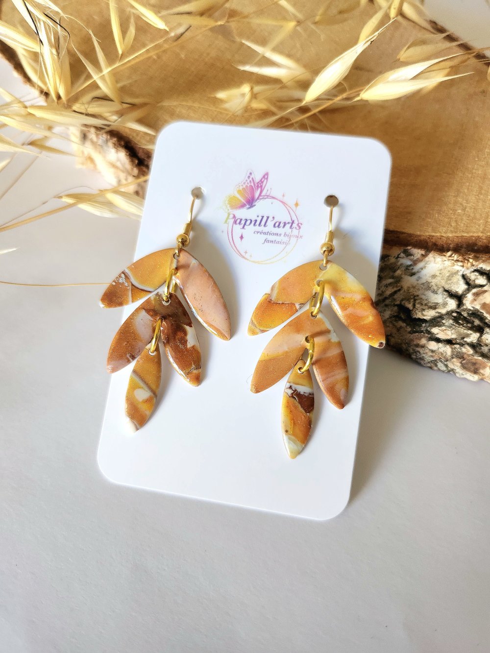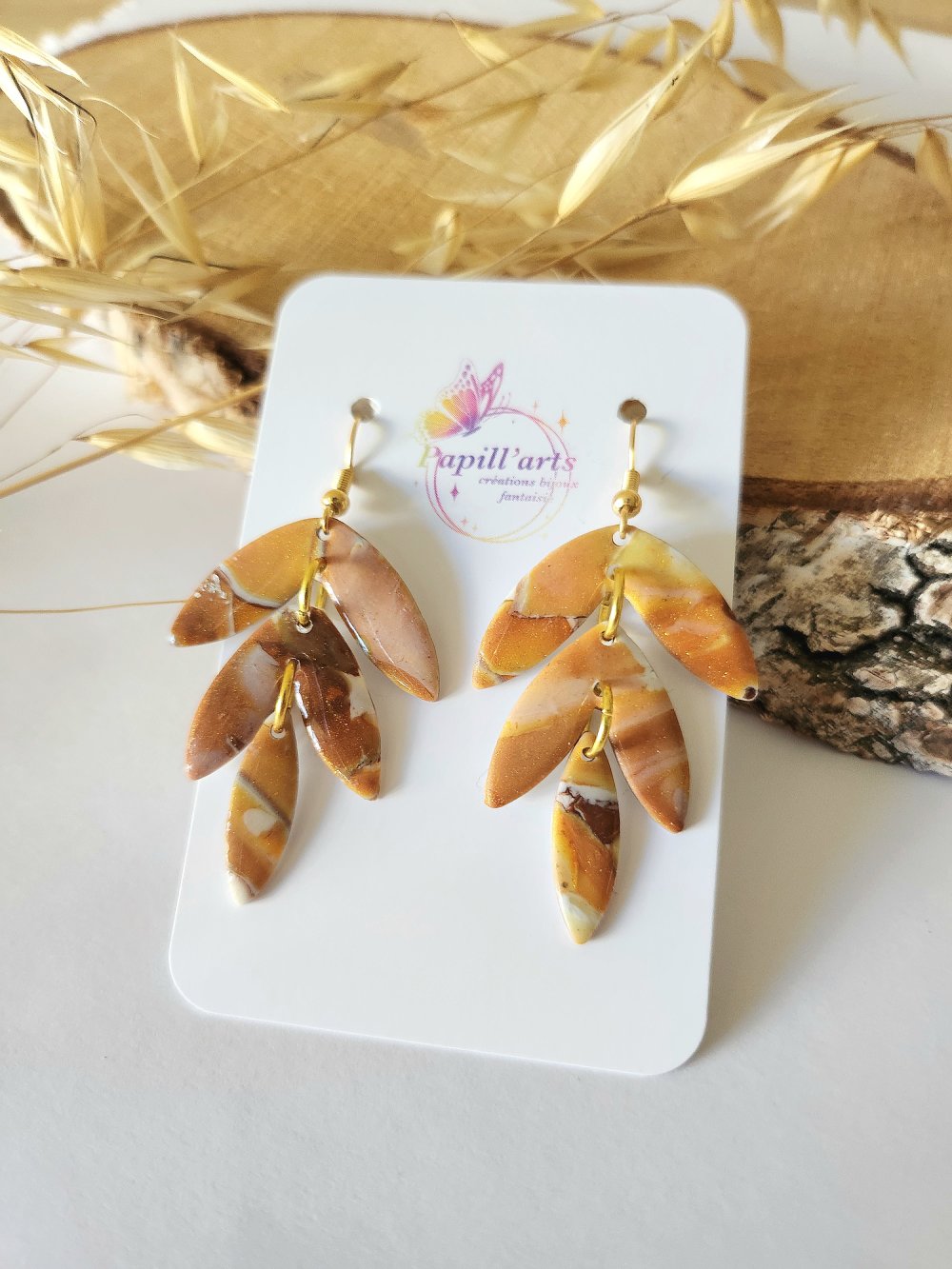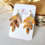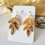 Création unique réalisé en pate polymère avec différentes nuances de marron blanc et orange pailletté. Chaque pièce est fini avec un gel transparent pour protéger et apporter plus de lumière a chaque d'entre elles.
