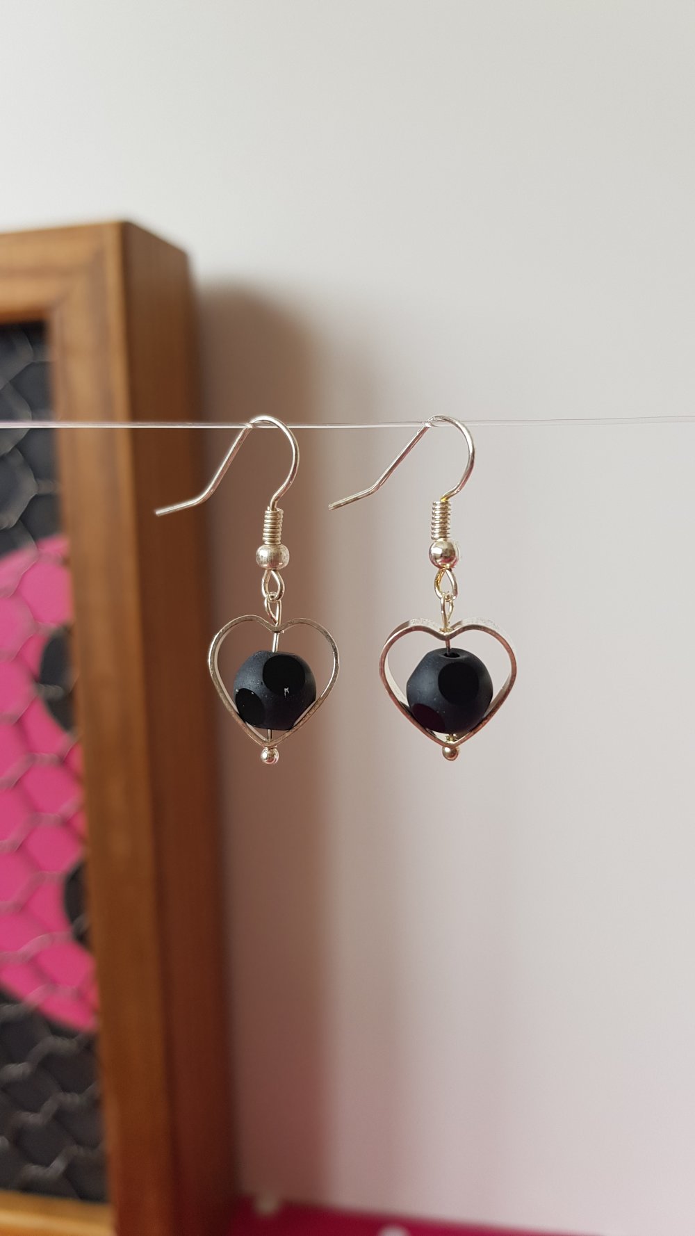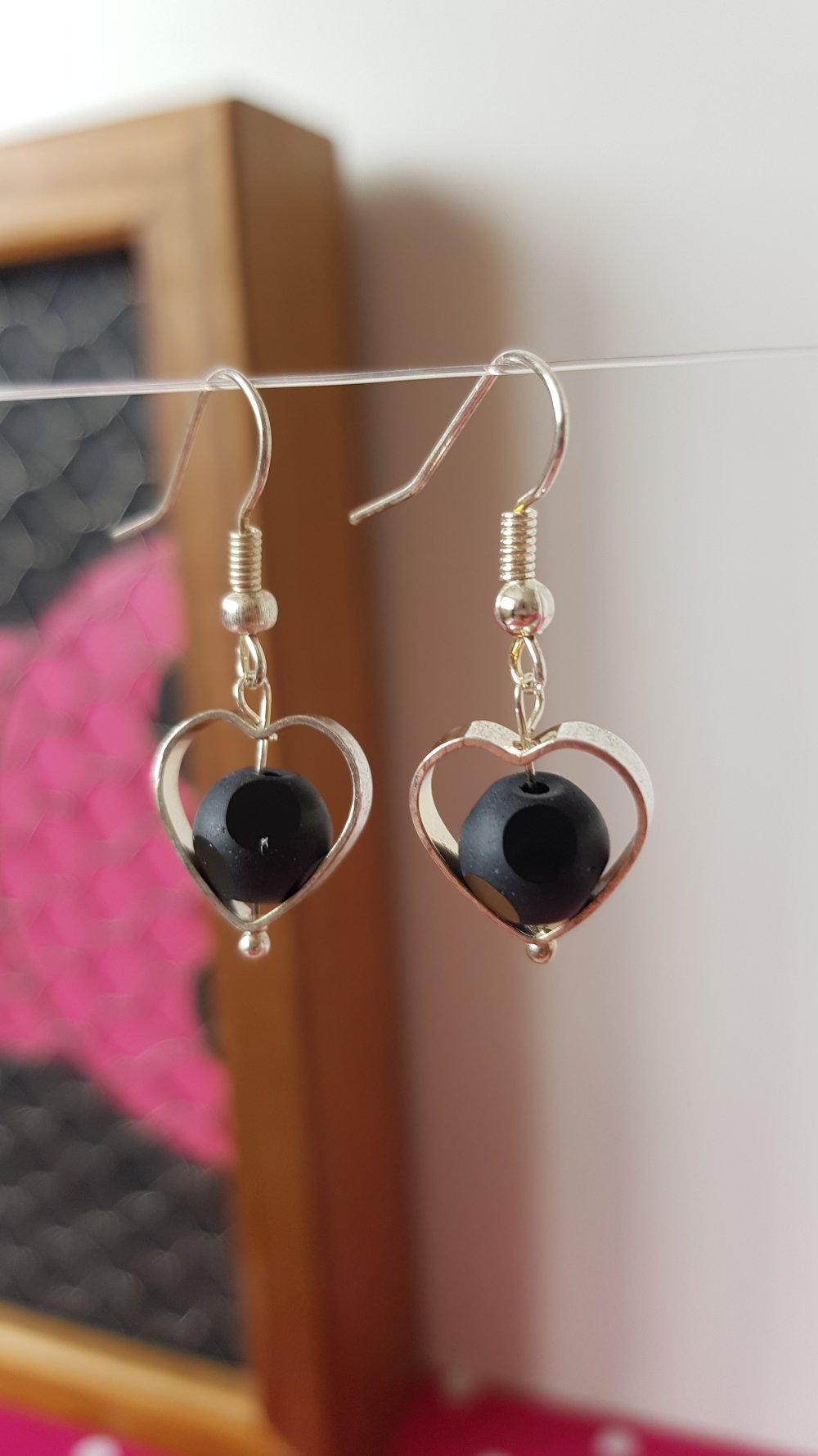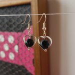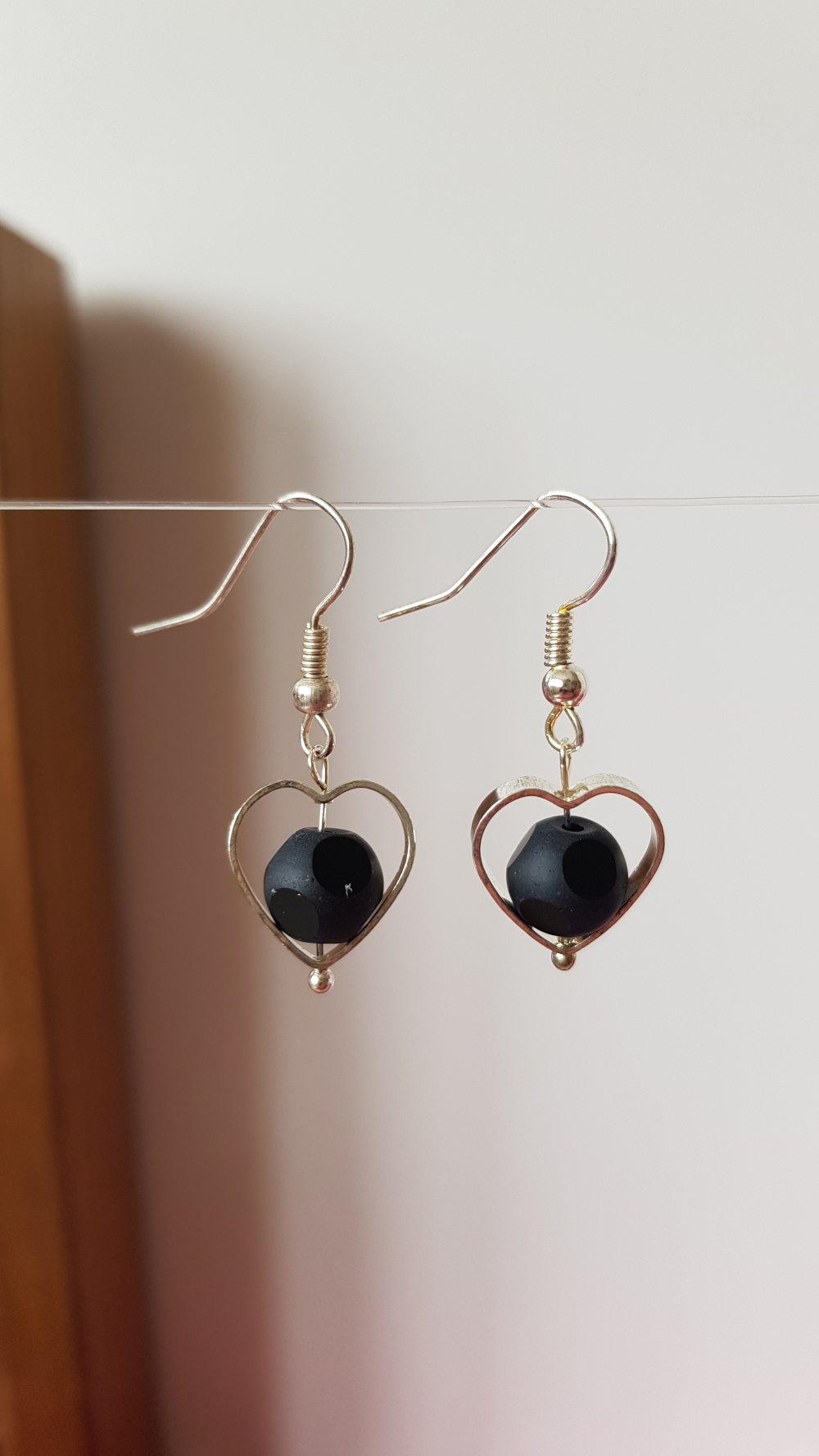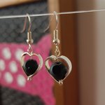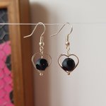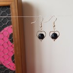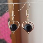 Jolies et chic paire de boucles d'oreilles pendantes en forme de cœur ajouré avec à son centre une balle perle en verre mat, qui n'est pas ronde mais polie et brillantes sur certaine rondeurs, légères et remarquable !
