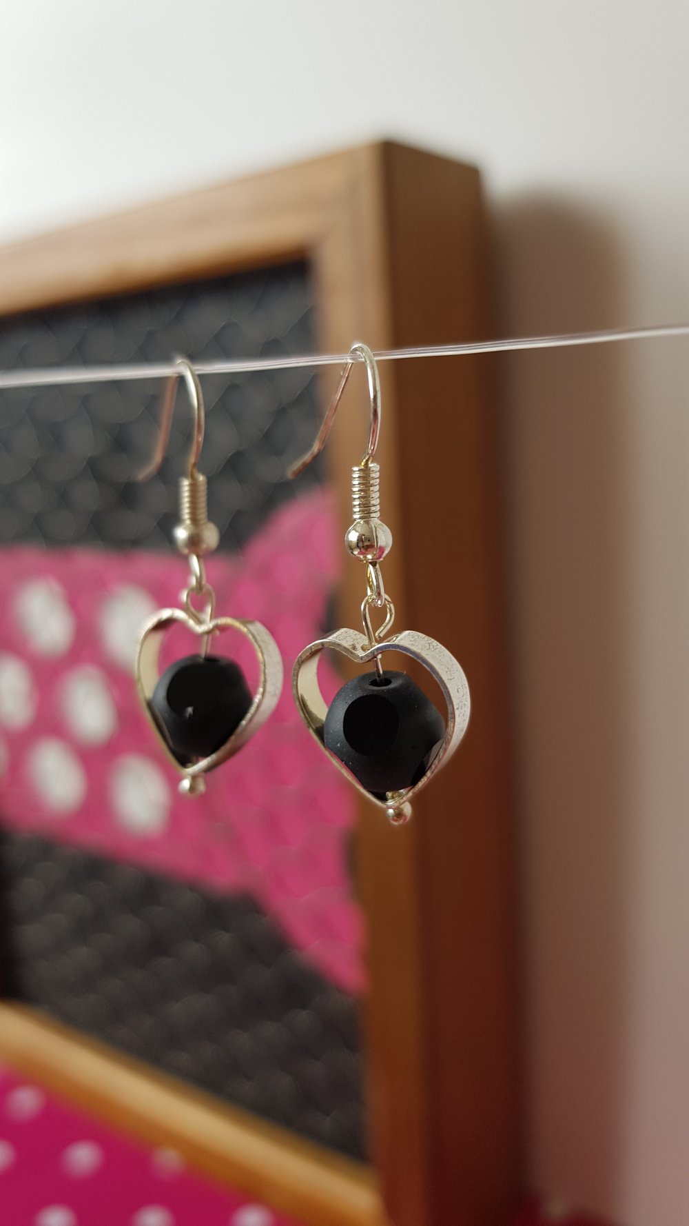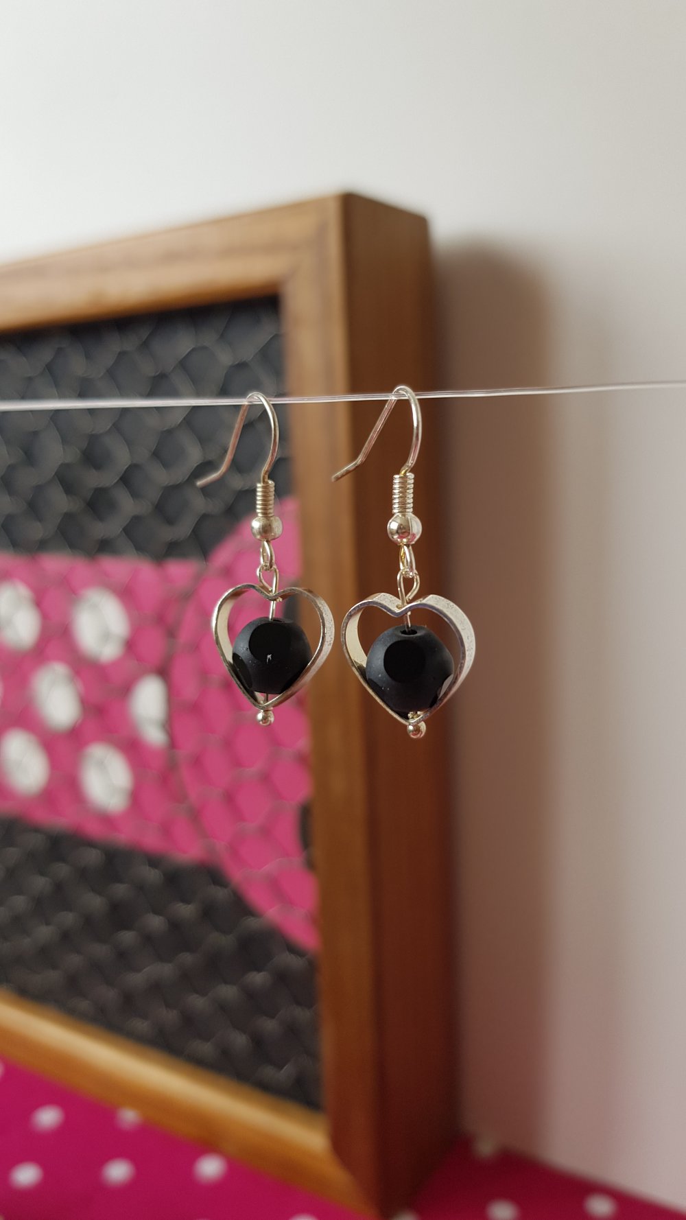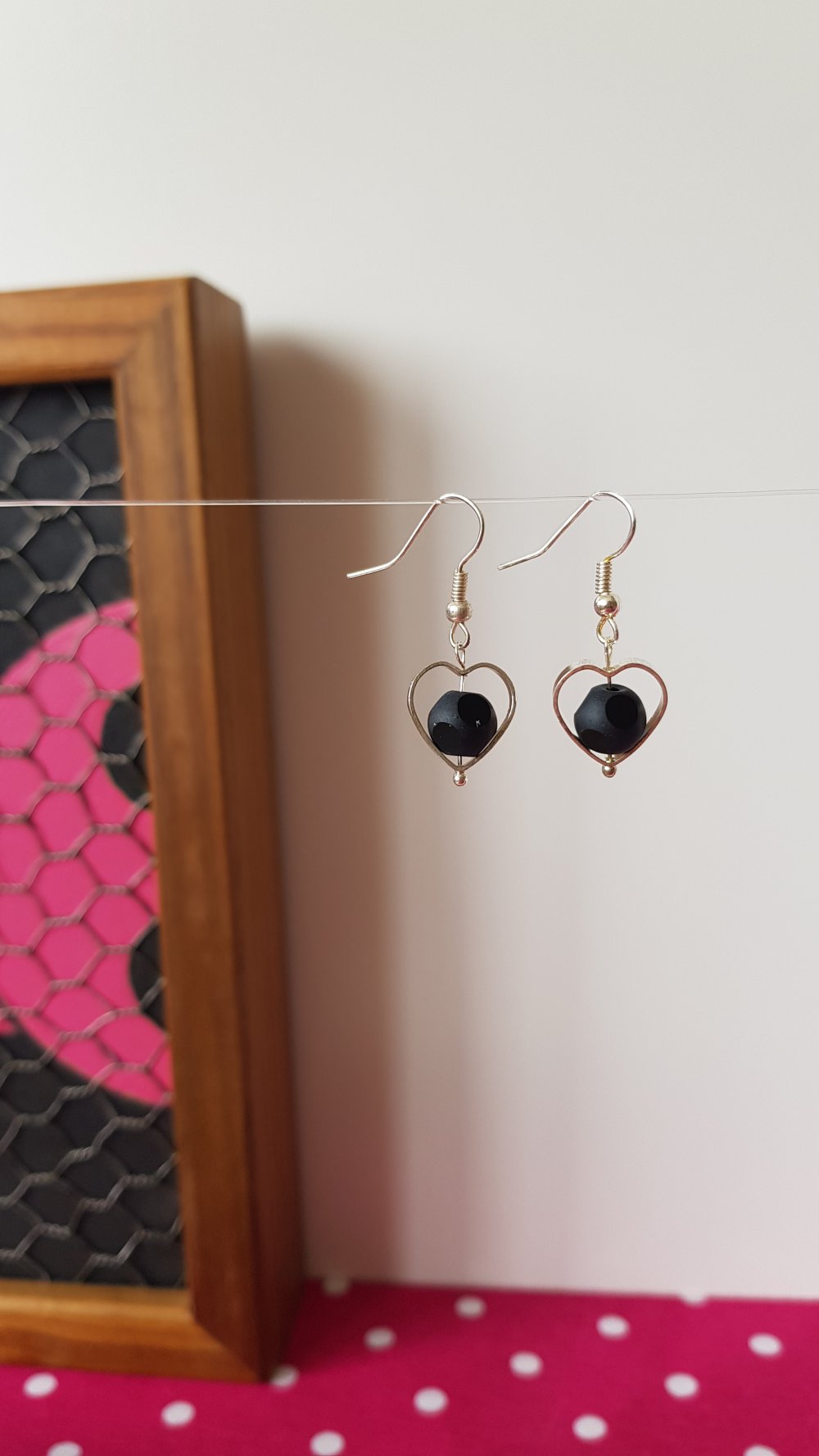 Jolies et chic paire de boucles d'oreilles pendantes en forme de cœur ajouré avec à son centre une balle perle en verre mat, qui n'est pas ronde mais polie et brillantes sur certaine rondeurs, légères et remarquable !