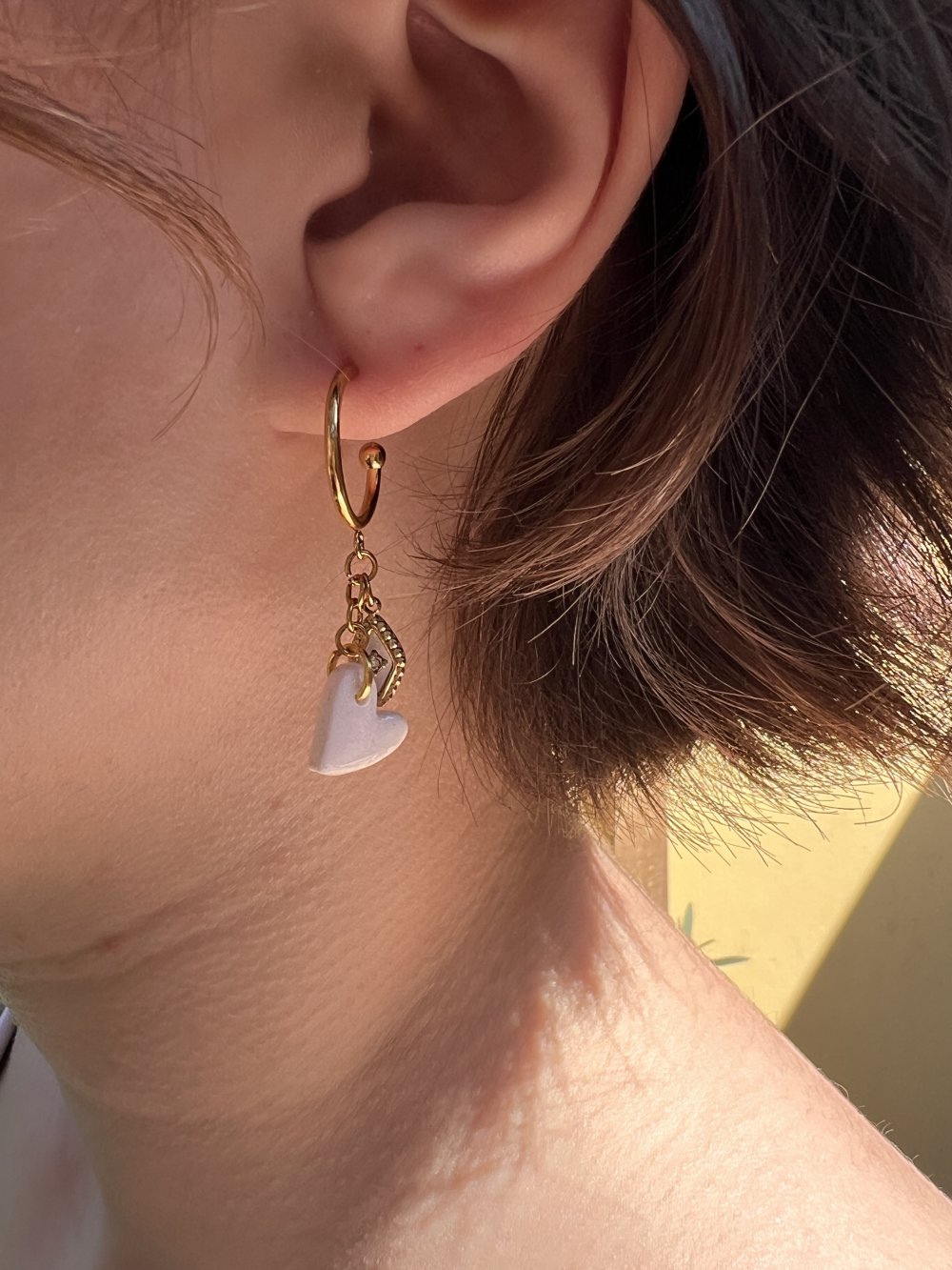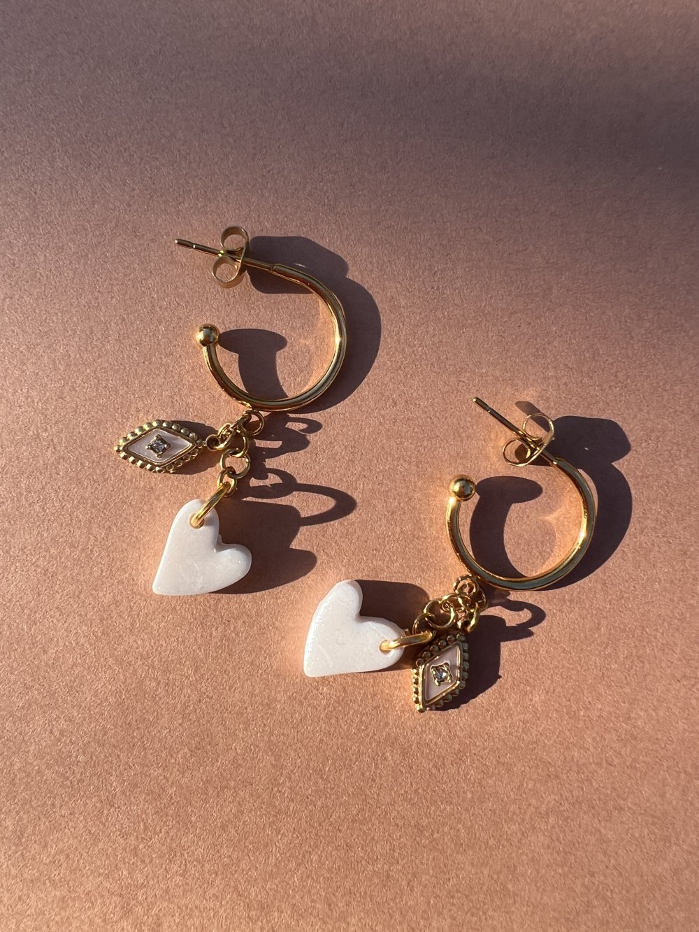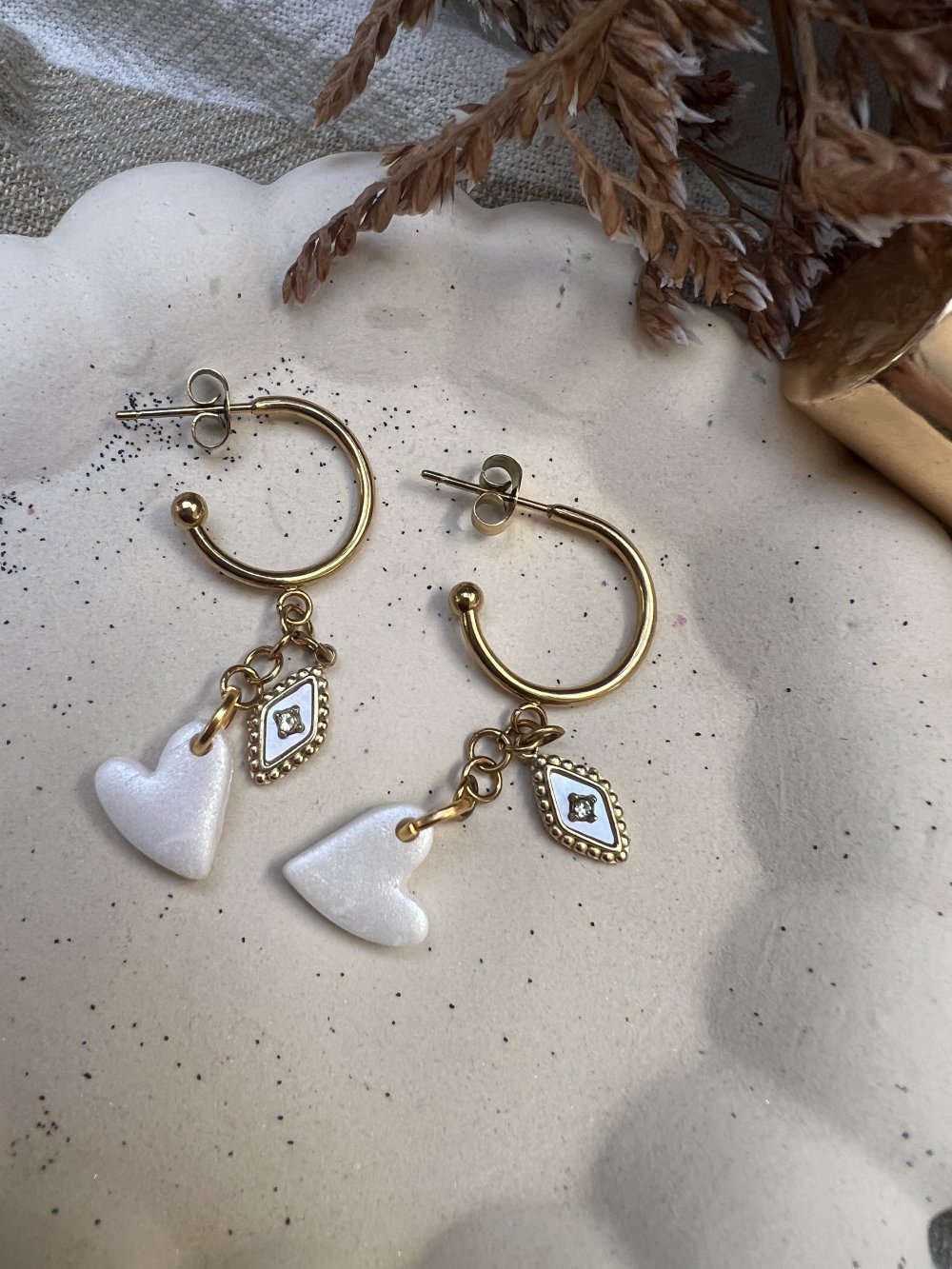 Une créole dorée fine, un cœur blanc nacré en argile polymère et un charm œil doré — les Boucles Céleste jouent sur la douceur et le mystère. Légères et féminines, elles se portent au quotidien comme pour les grandes occasions.