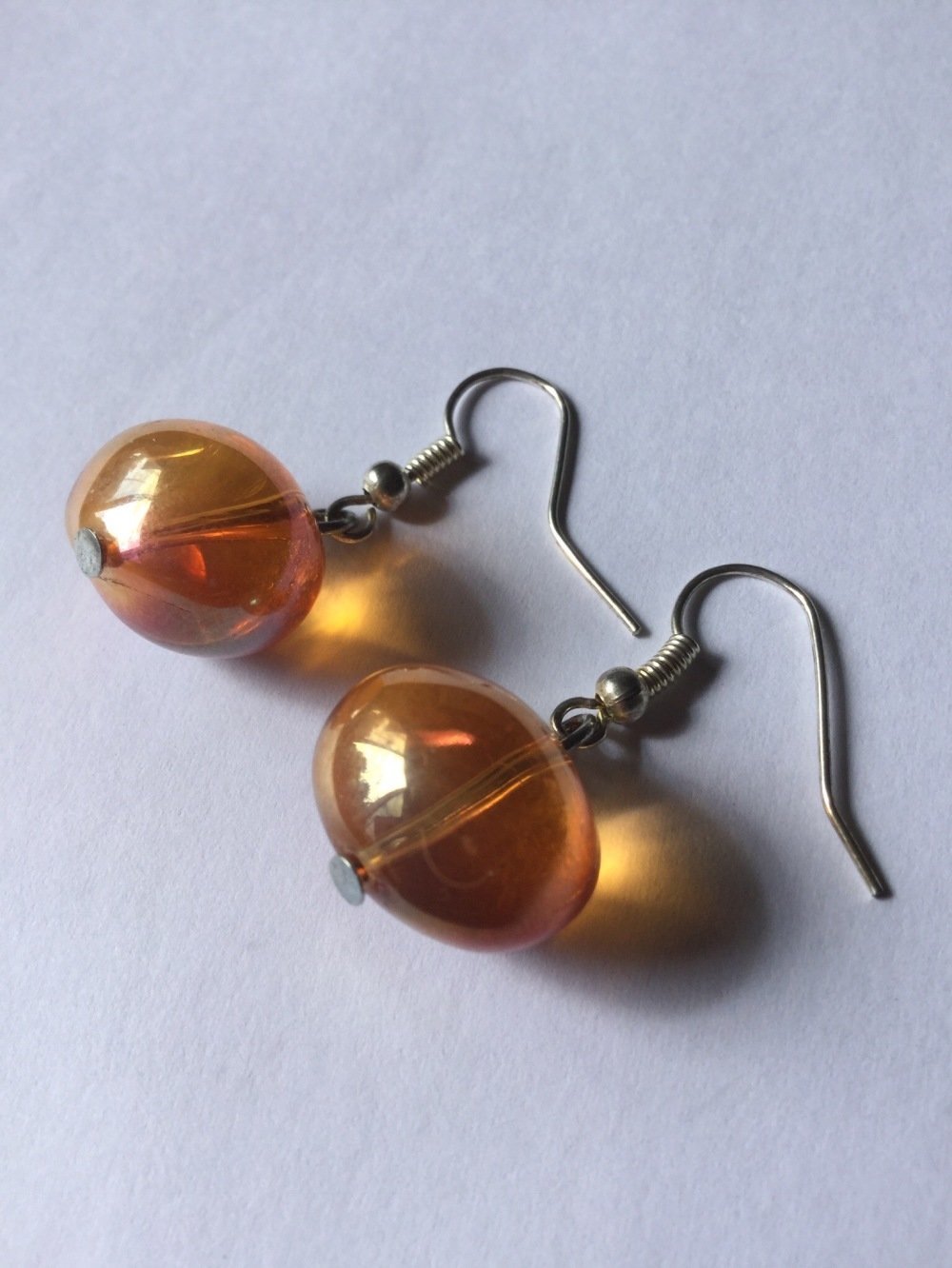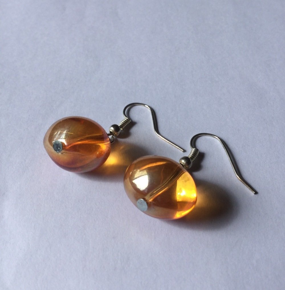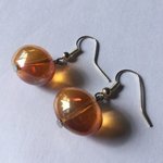 Boucles d'oreille avec grosse perle ovale translucide aux reflets jaune orangés.