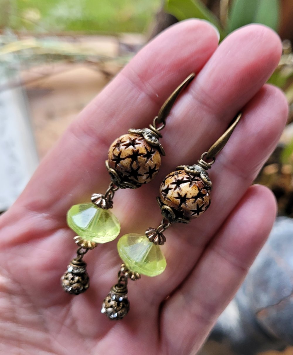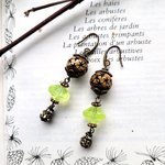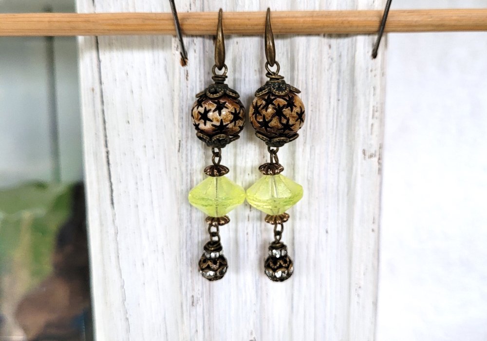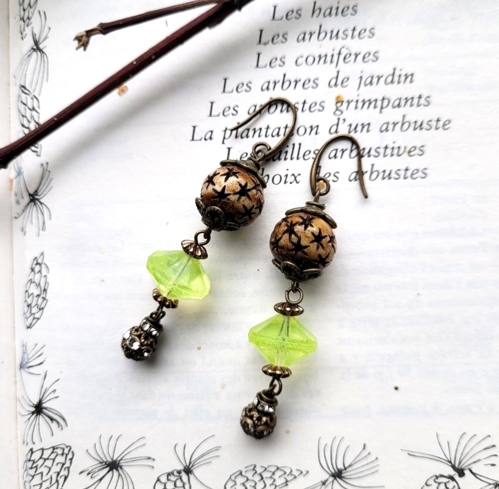 "Invitation Poétique" : pour ces boucles d'oreille composées de perles anciennes verre vaseline, perle corne étoile, perle laiton strass, coupelles diverses en bronze .