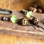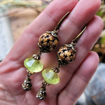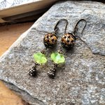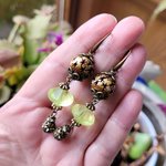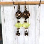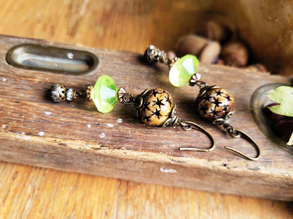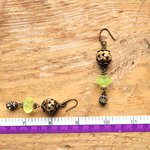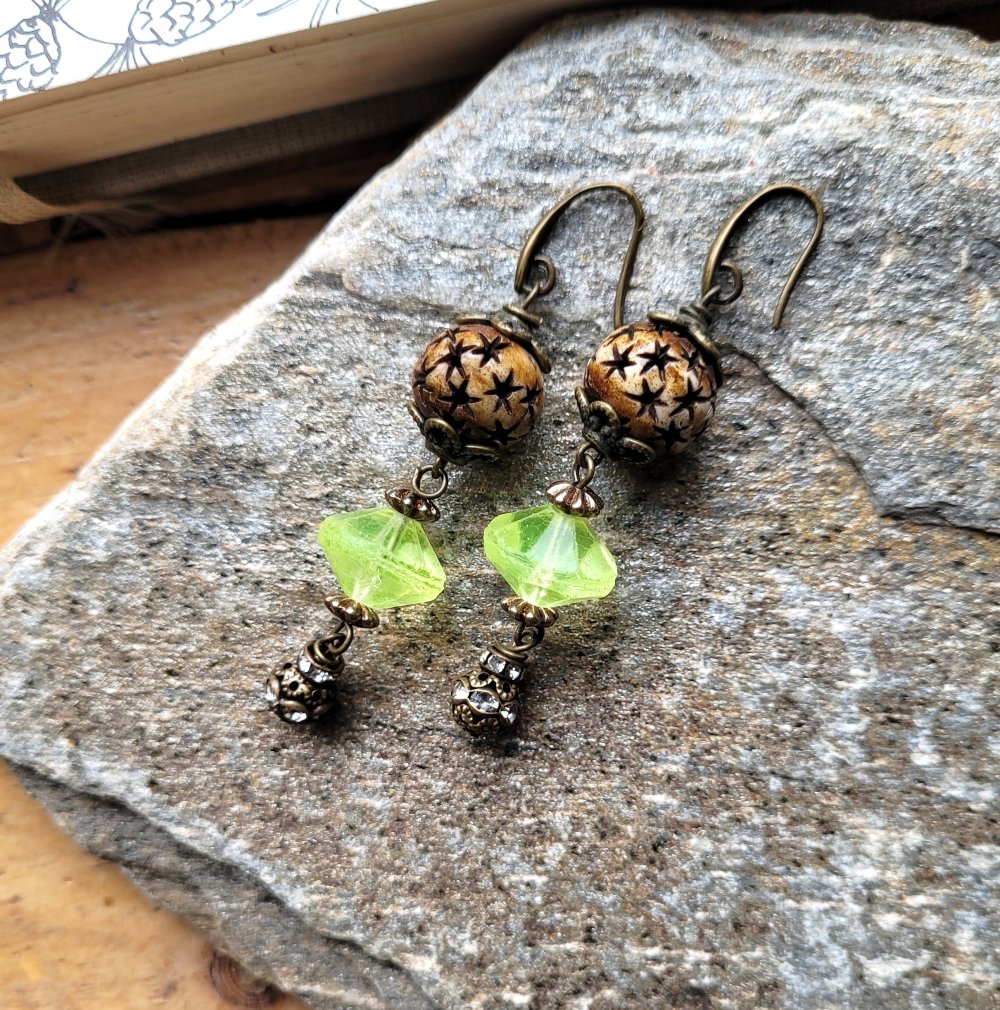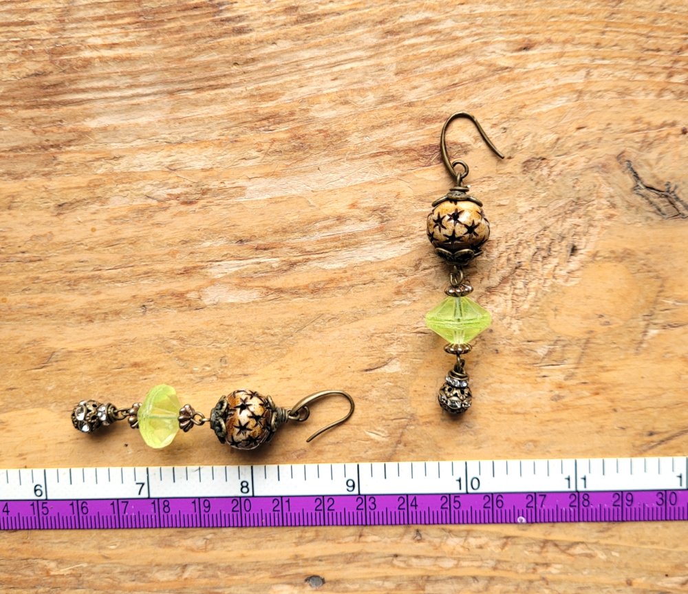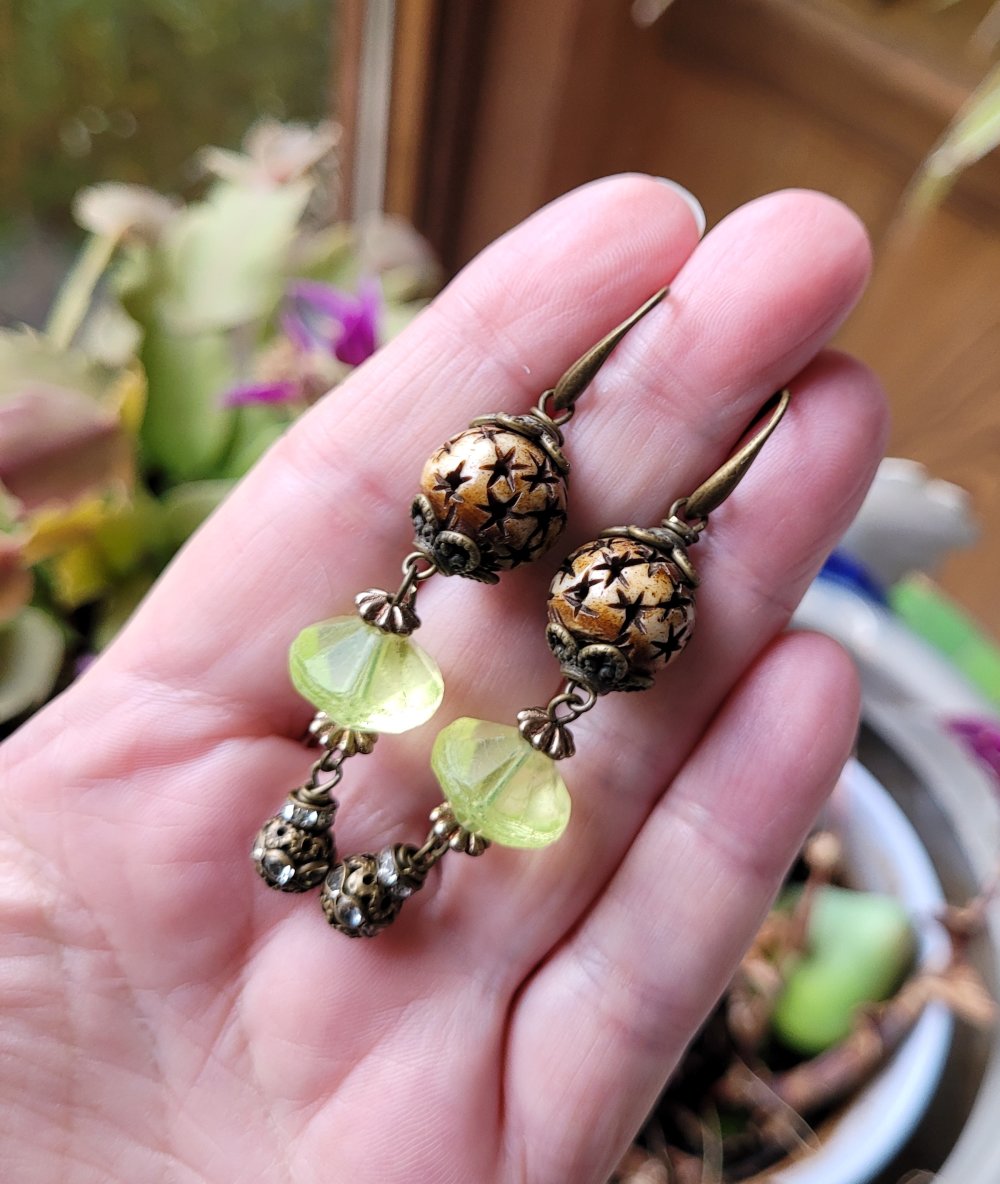 "Invitation Poétique" : pour ces boucles d'oreille composées de perles anciennes verre vaseline, perle corne étoile, perle laiton strass, coupelles diverses en bronze .