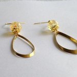 Boucles d'oreille, très légères, composées d'un anneau doré en forme de goutte de 4 cm surmonté d'une perle translucide craquelée dorée jaune orangé de 1 cm. La perle repose sur une coupelle dorée forme fleur.