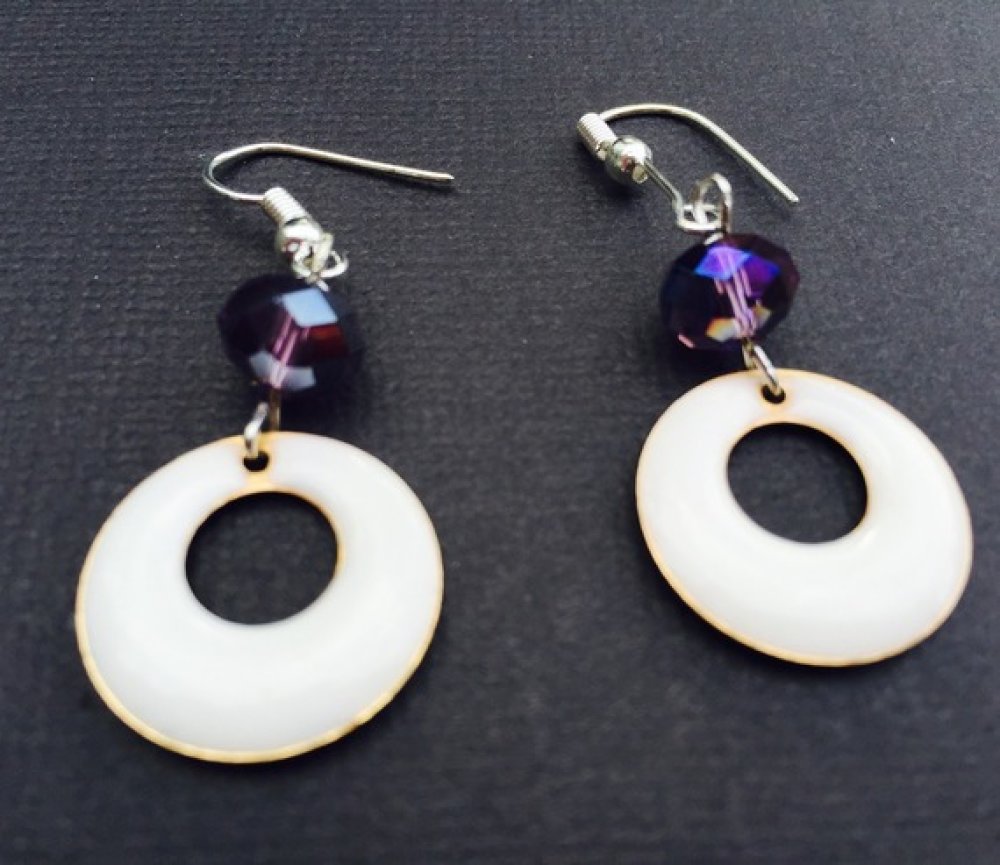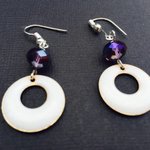Boucles d'oreille, très légères, composées d'un sequin émaillé blanc, ouvert en son centre, de 20 mm surmonté d'une perle abacus facettée de couleur mauve.