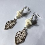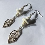 Boucles d'oreille, très légères, composées, de haut en bas : d'une petite perle ronde, blanche, légèrement nervurée de noir, d'une perle granuleuse blanche, d'une perle plate en bois blanc crème, d'une petite perle en bois blanc crème, et dernière perle identique à la première Sous cet ensemble de perles se balance une fine feuille de 2,5 cm en métal doré très pâle. La longueur totale de la boucle est de 7,4 cm.
