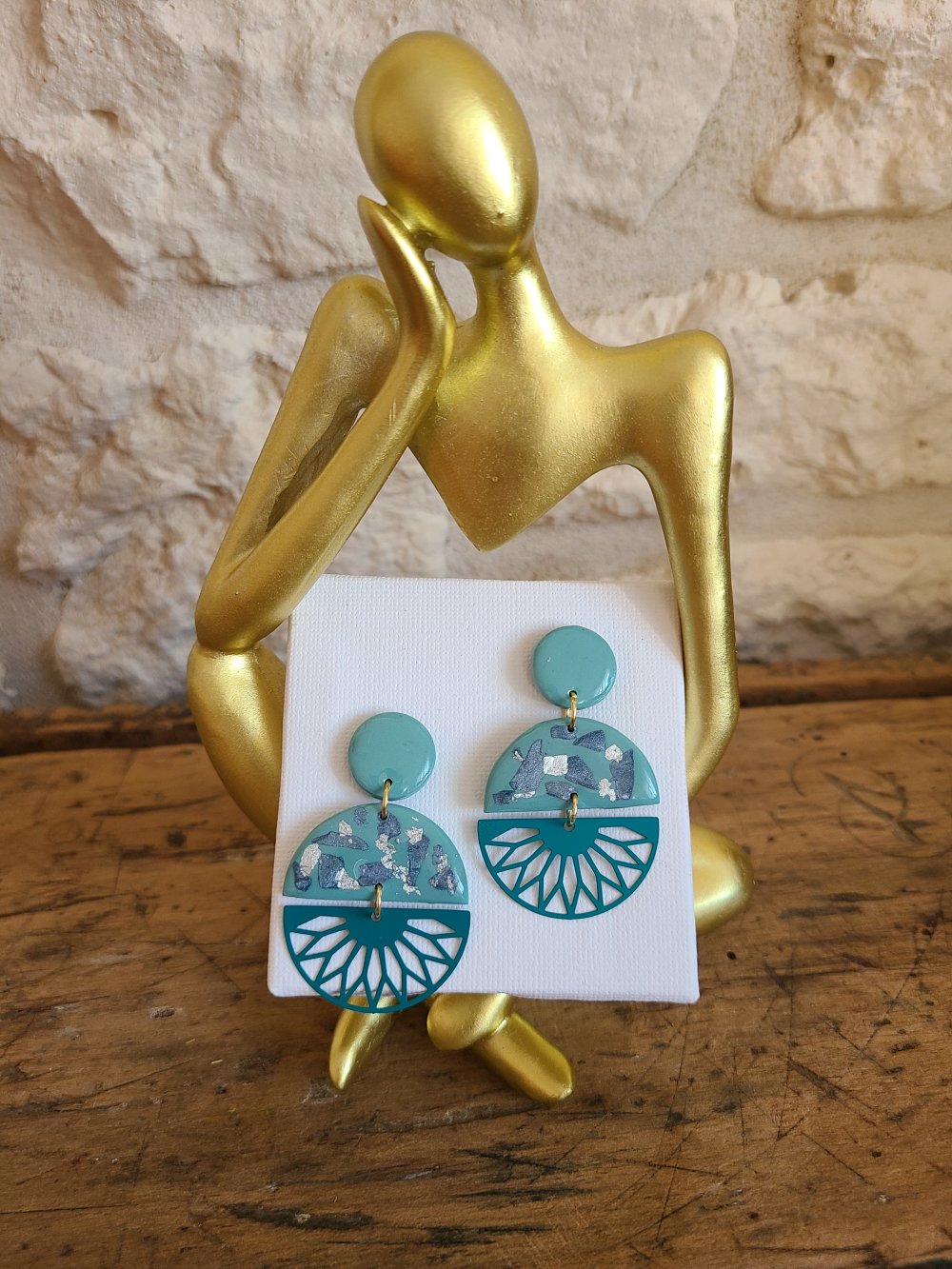 Ces boucles d' oreille faites à la main en pâte polymère sont inspirées des formes élégantes de l ' art déco . Elles jouent avec la géométrie et la lumière . Un demi cercle métal ajouré rappelle un éventail stylisé et un autre demi cercle , en pâte polymère , avec un mélange de bleu et argent confère un charme rétro et contemporain à la fois. Elles sont à la fois graphiques , légères et lumineuses .