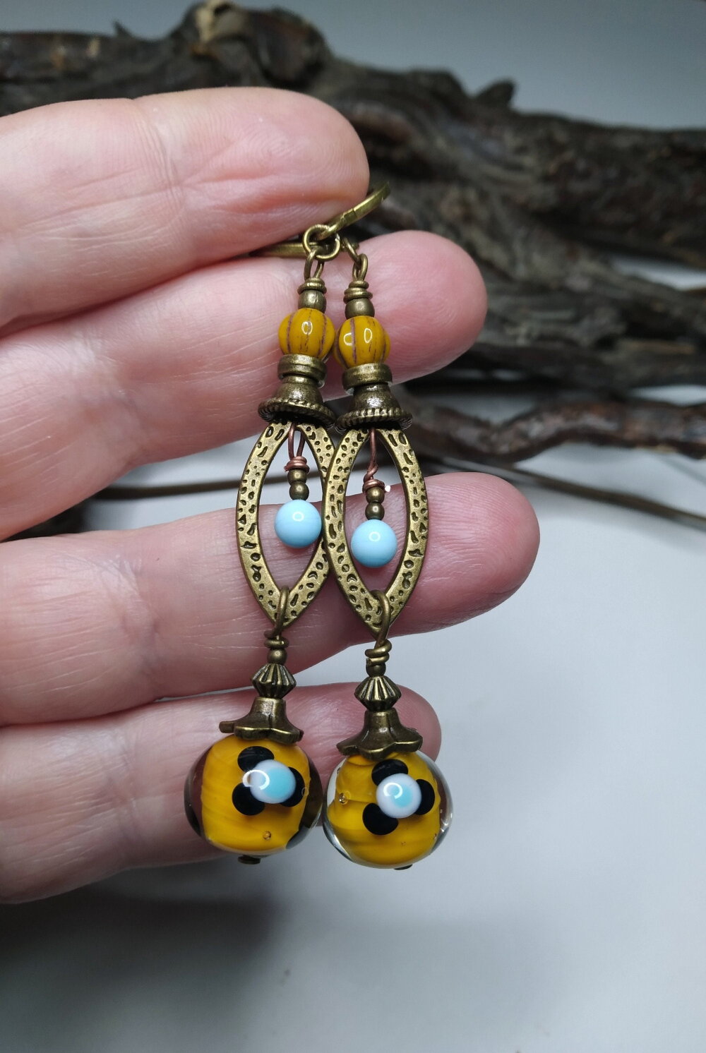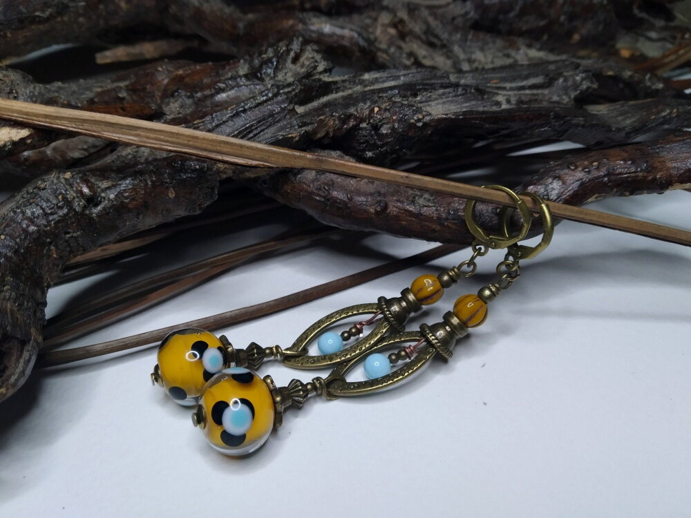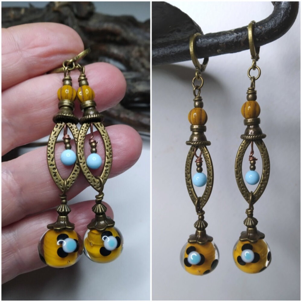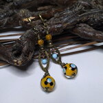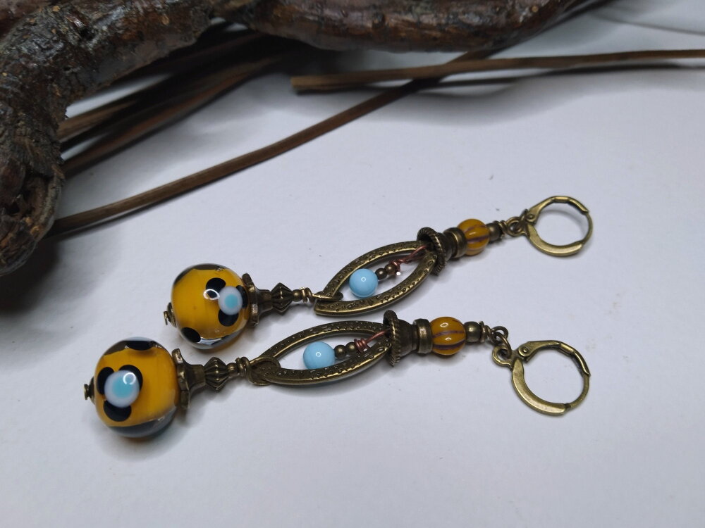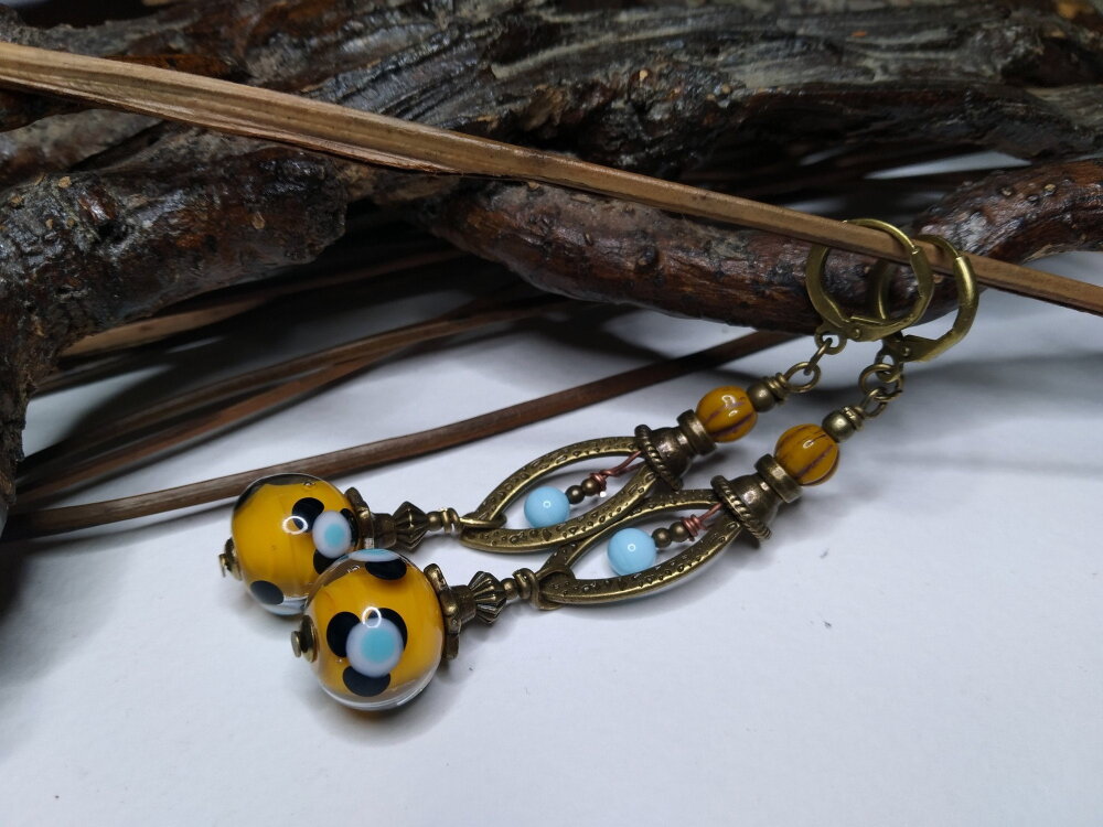 Boucles d'oreille bohèmes, perles artisanales verre filé au chalumeau et verre de bohème, jaune/bleu, look vintage, cadeau femme