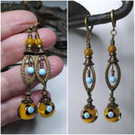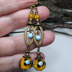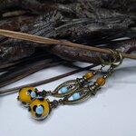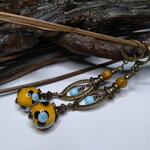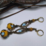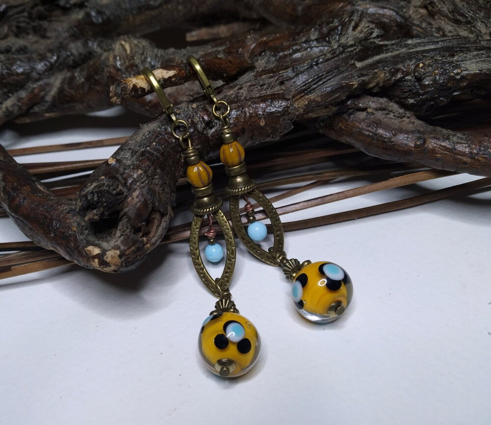 Des boucles d'oreille bohèmes, avec un petit coté vintage, avec de belles perles artisanales en verre filé au chalumeau de Sylviane, jaune et bleu, elles sont gaies et pleines de fraicheur pour des journées toniques. Ce sont de boucles d'oreilles très faciles à porter et à marier.