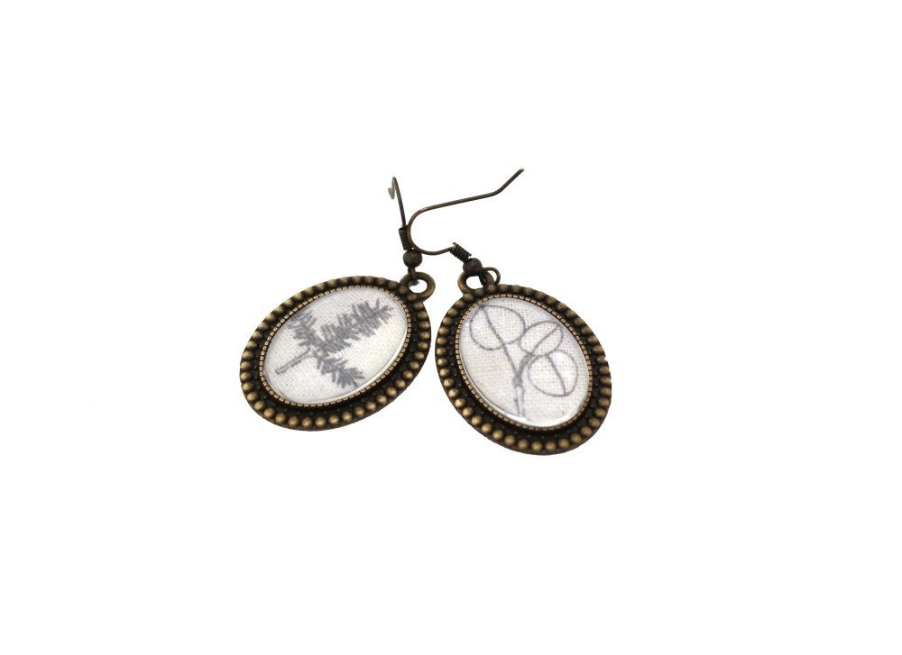 Boucles d'oreille cabochon. Les crochets et les supports sont en métal couleur bronze, les cabochons sont en verre, et le tissu est en coton.