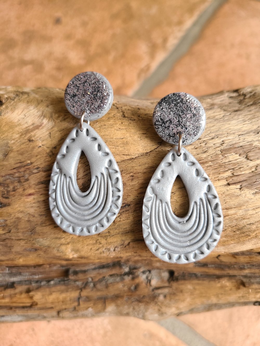Ces boucles d' oreille faites à la main en pâte polymère mêlent la force du minéral à la délicatesse du geste artisanal .Les nuances grises ponctuées de reflets sombres rappellent la beauté silencieuse des pierres nées du feu .