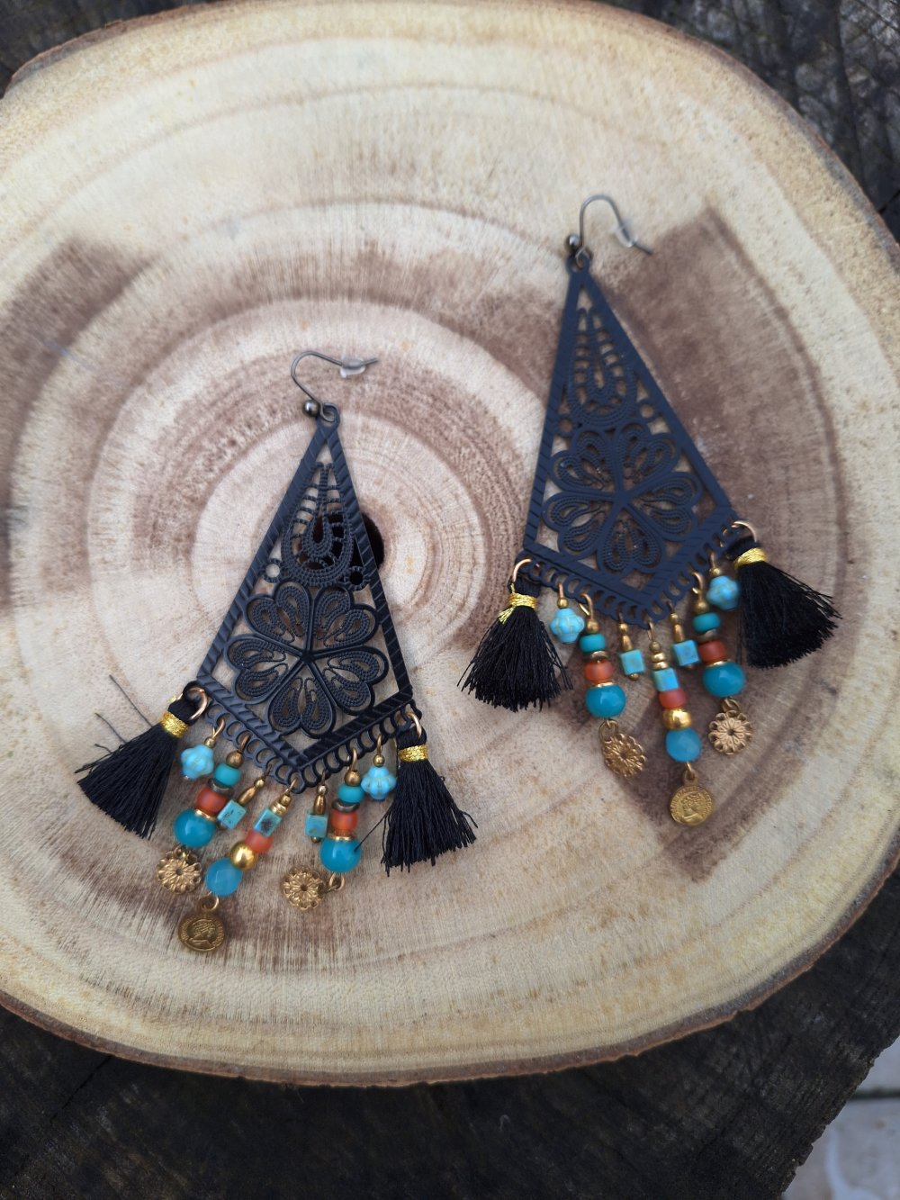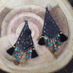 Boucles d'oreille ,estampes en métal léger noir, pompons de fil corail clair et turquoise, perles de verre et métal doré