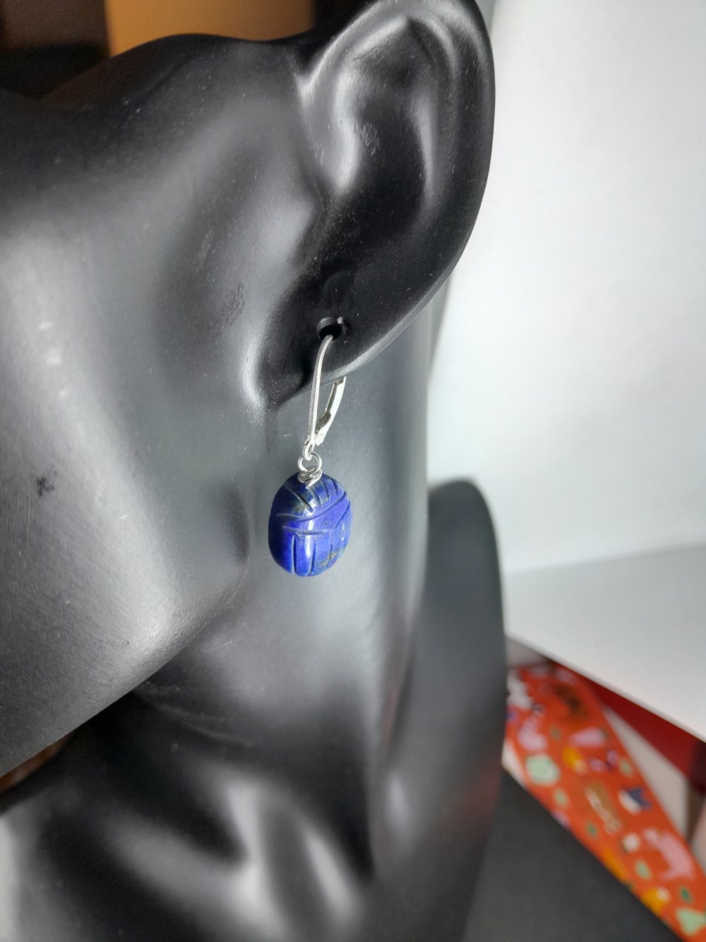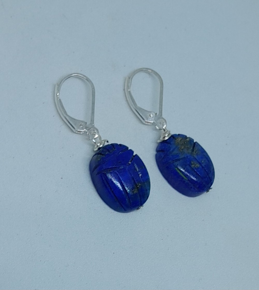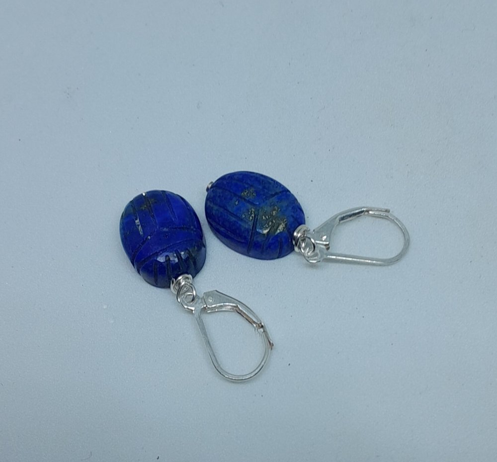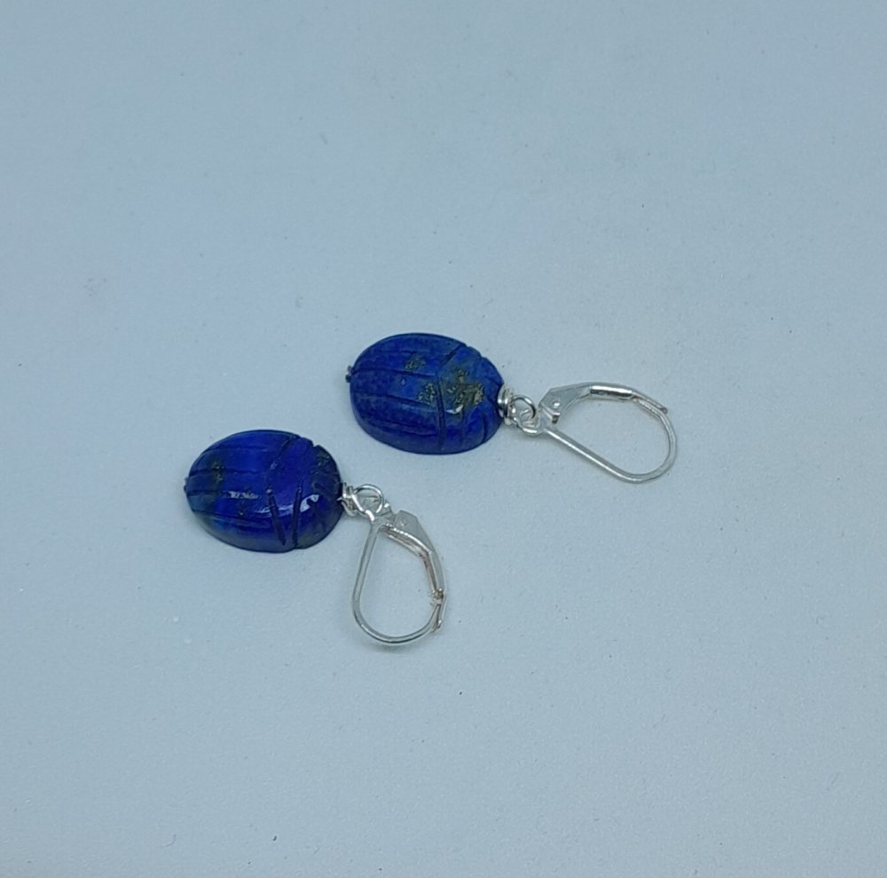 boucles d'oreille dormeuses en argent 925 (poinçon) avec lapis-lazuli gravés en forme de scarabée 16x12 mm