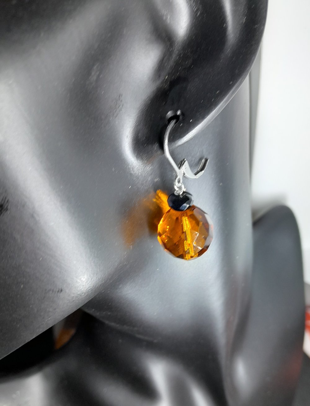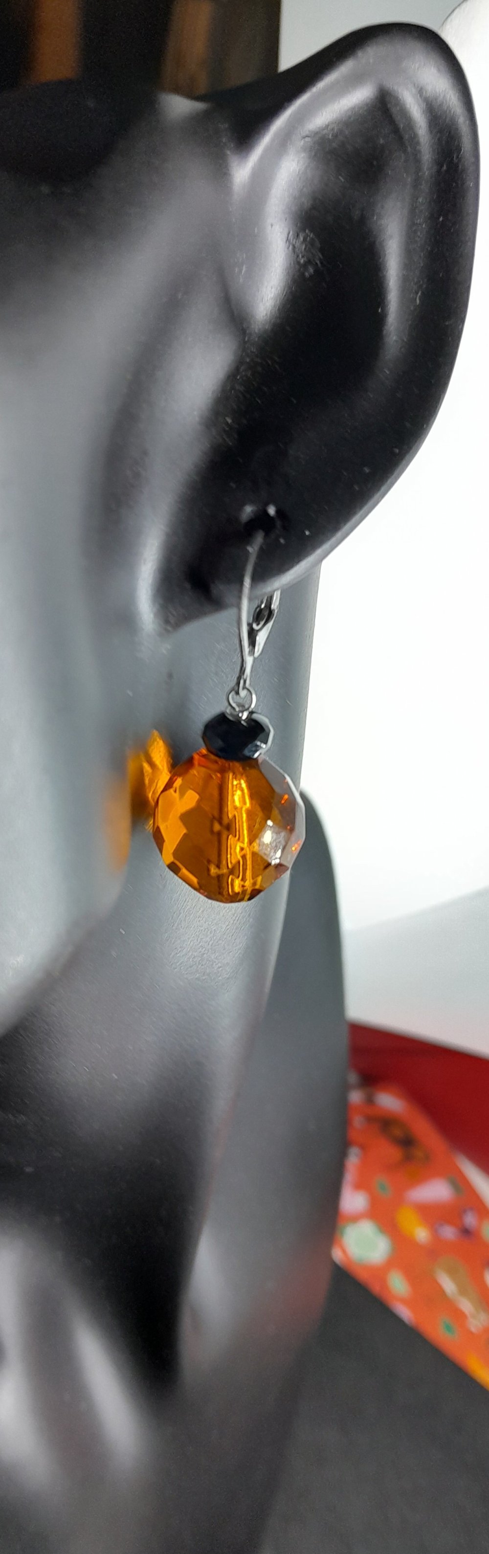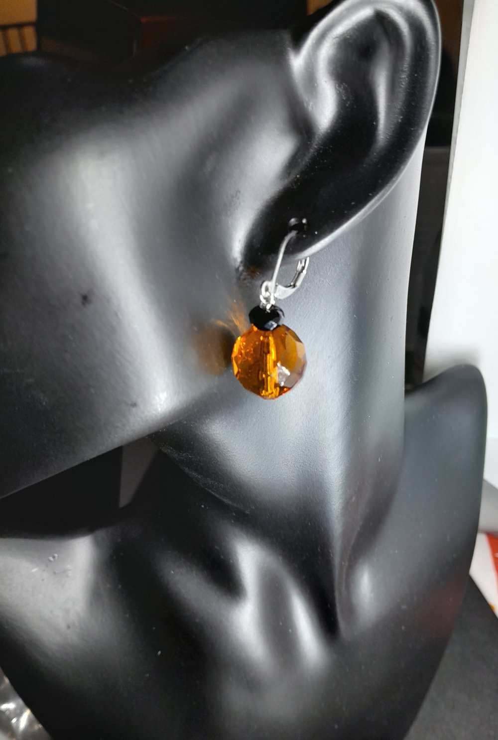 boucles d'oreille dormeuses en acier inoxydable et verre de bohème facetté ambre 14 mm et noir 6 mm