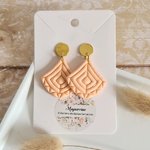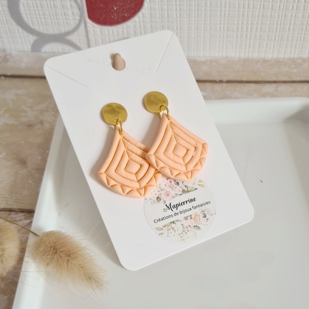 Chaque paire est réalisée à partir de pâte polymère de couleur pêche au design géométrique et texturé, montée sur un clou en acier inoxydable doré pour une finition élégante et résistante.