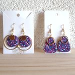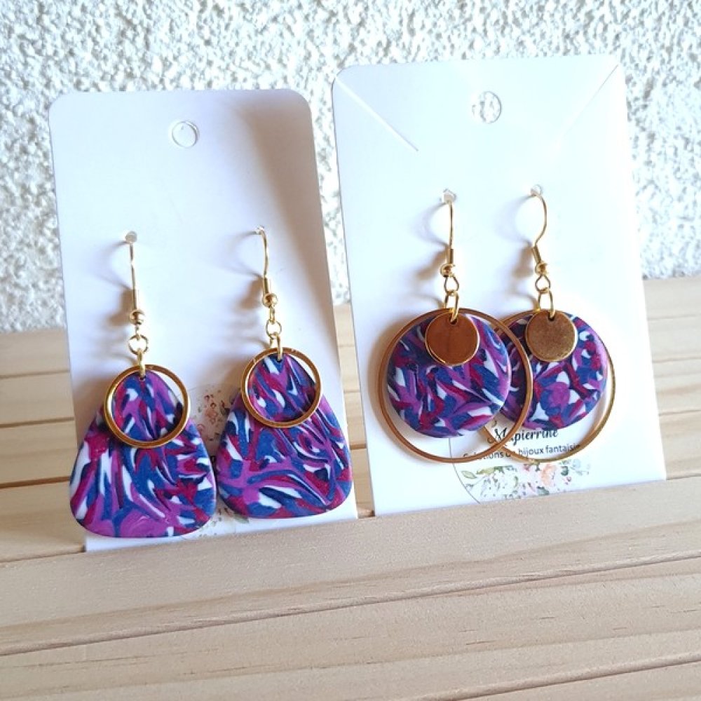 Chaque paire se compose d’éléments en pâte polymère aux motifs abstraits violets, roses et blancs, associant harmonieusement des anneaux et disques dorés en acier inoxydable.