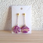 Boucles d’oreilles artisanales composées d’un pendentif en pâte polymère marbrée violet/blanc avec touches scintillantes, protégé par une fine couche de résine pour un bel éclat et une meilleure durabilité, monté sur chaîne rigide torsadée et clou doré en acier inoxydable, sans nickel et pensées pour un port quotidien confortable.