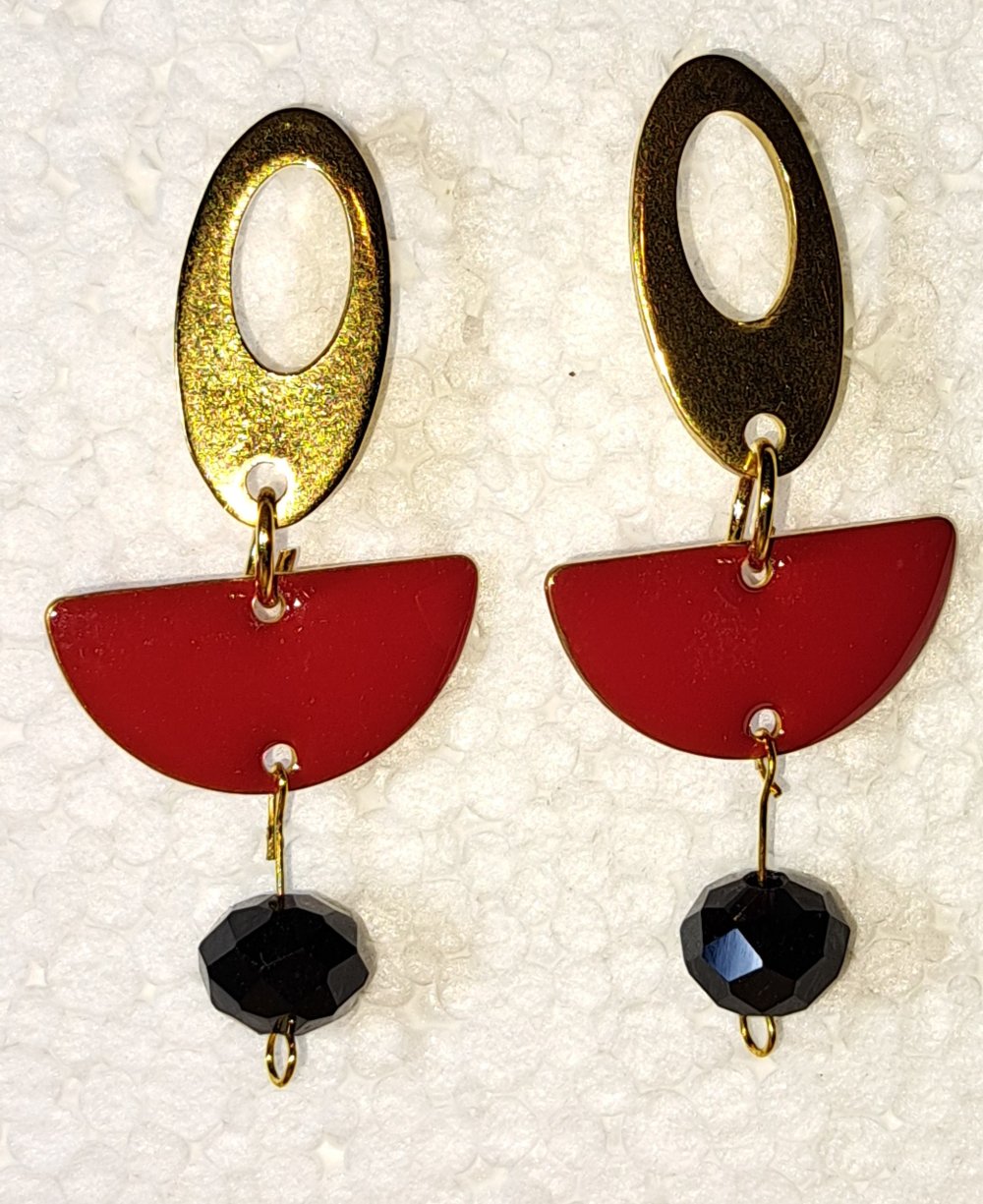 montage breloque demi disque émaillé rouge perle de verre noire , ovale évidé