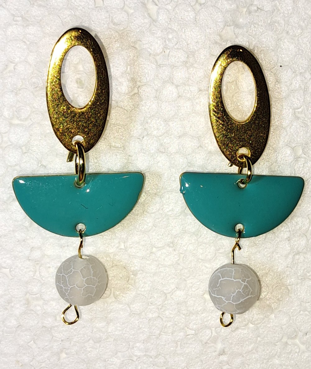 montage breloque demi disque émaillé turquoise, perle de verre blanche , ovale évidé