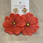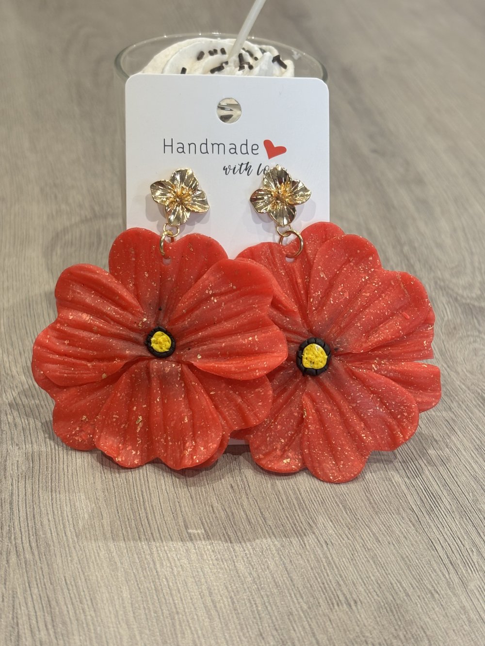 Boucle d’oreilles faites à entièrement à la main en pâte polymère et acier inoxydable représentant l’élégance en fleur avec des touches de feuilles d’or