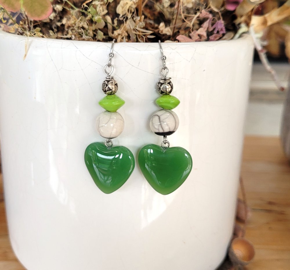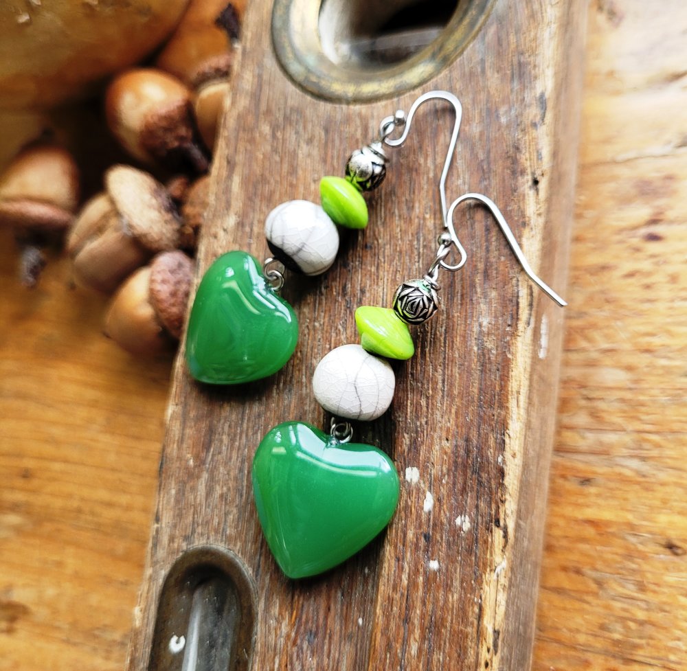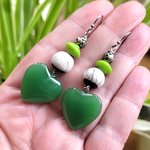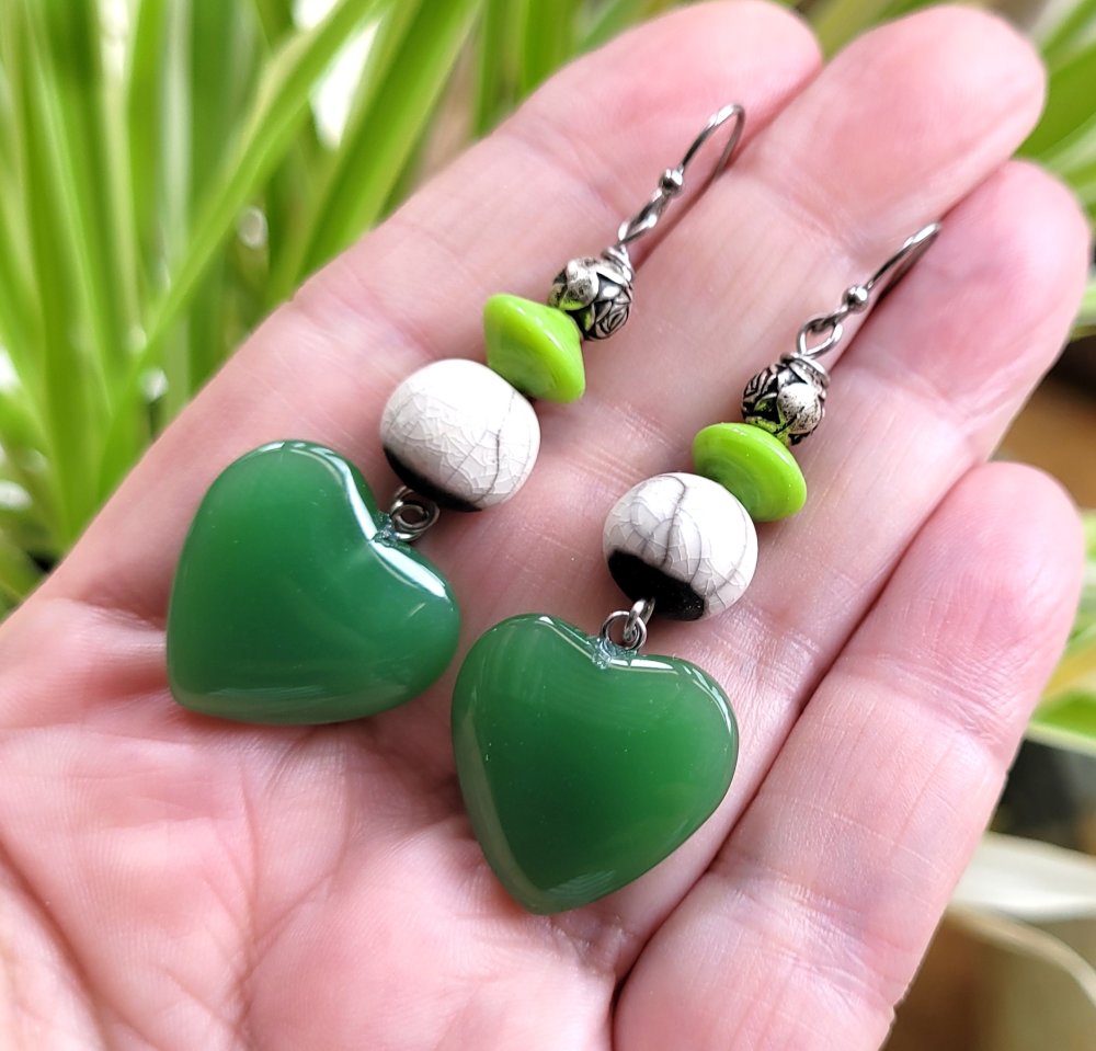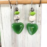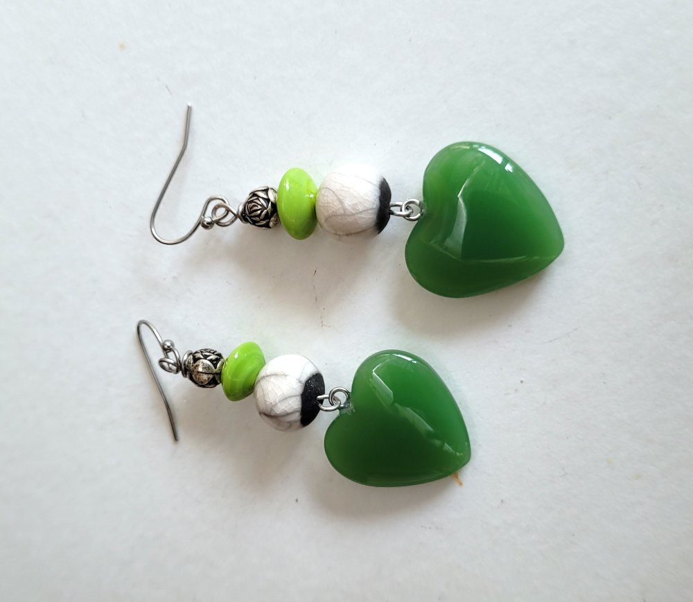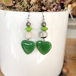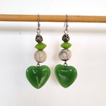 "Des Coeurs à Aimer " !!!!! pour ces boucles d'oreille romantiques à souhaits avec breloques coeurs en verre couleur vert pré , perles céramique raku d'artisan, perles soucoupes verre; perles roses en argent ....