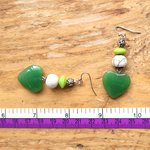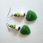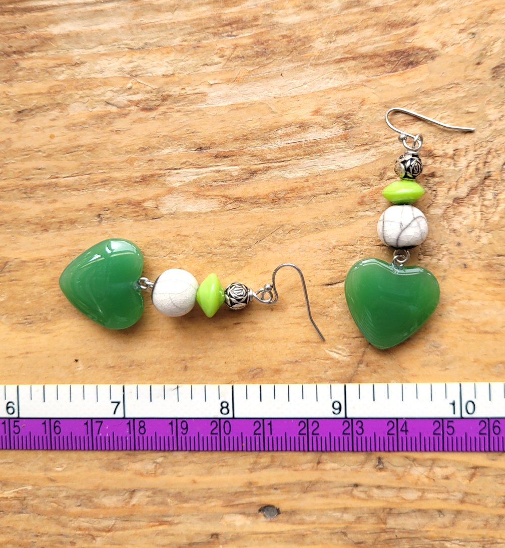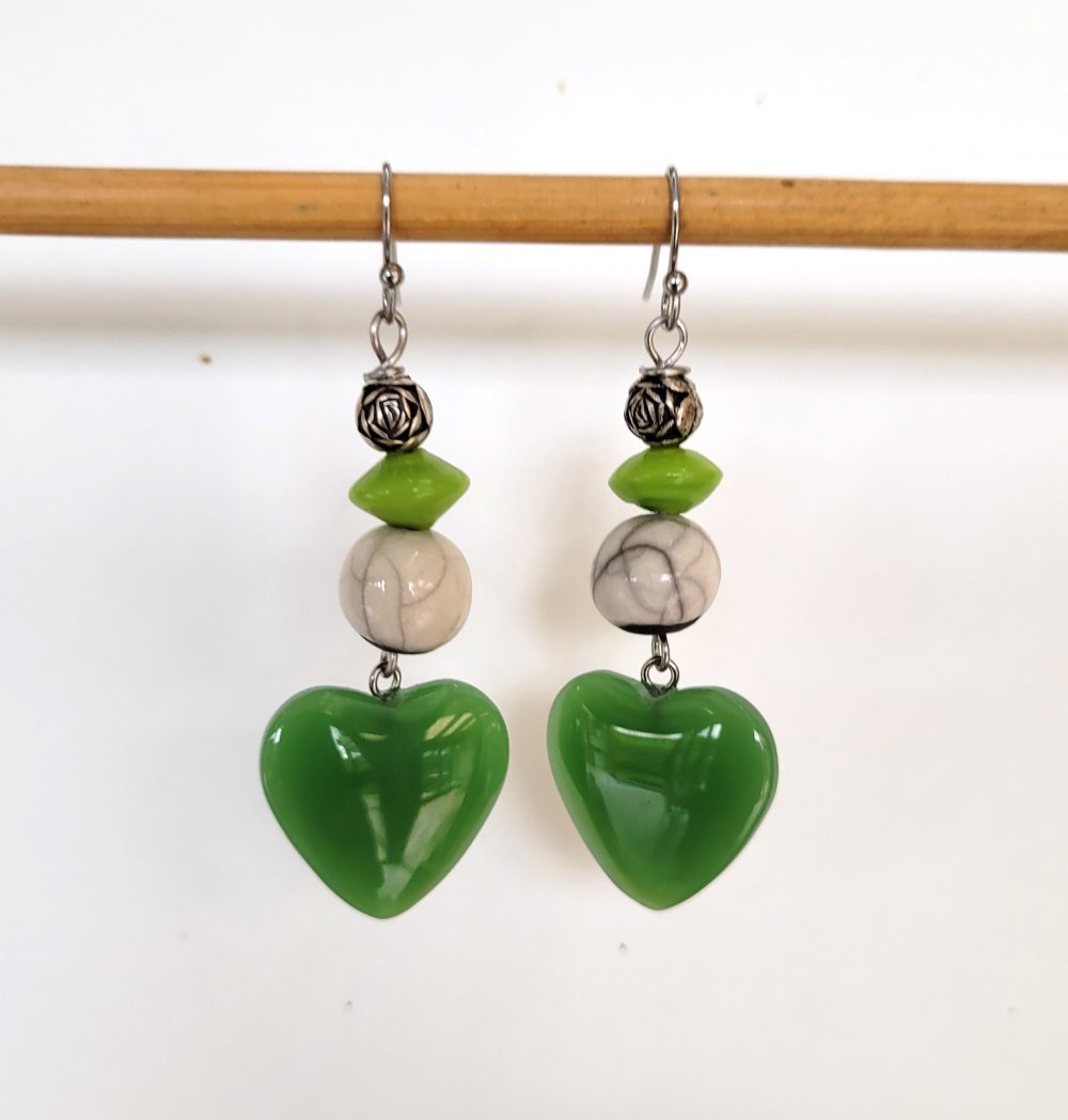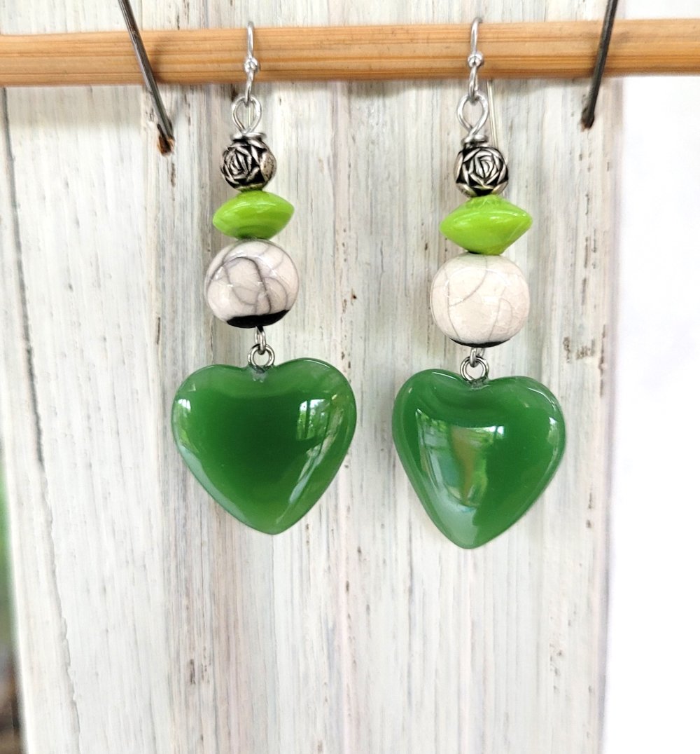 "Des Coeurs à Aimer " !!!!! pour ces boucles d'oreille romantiques à souhaits avec breloques coeurs en verre couleur vert pré , perles céramique raku d'artisan, perles soucoupes verre; perles roses en argent ....
