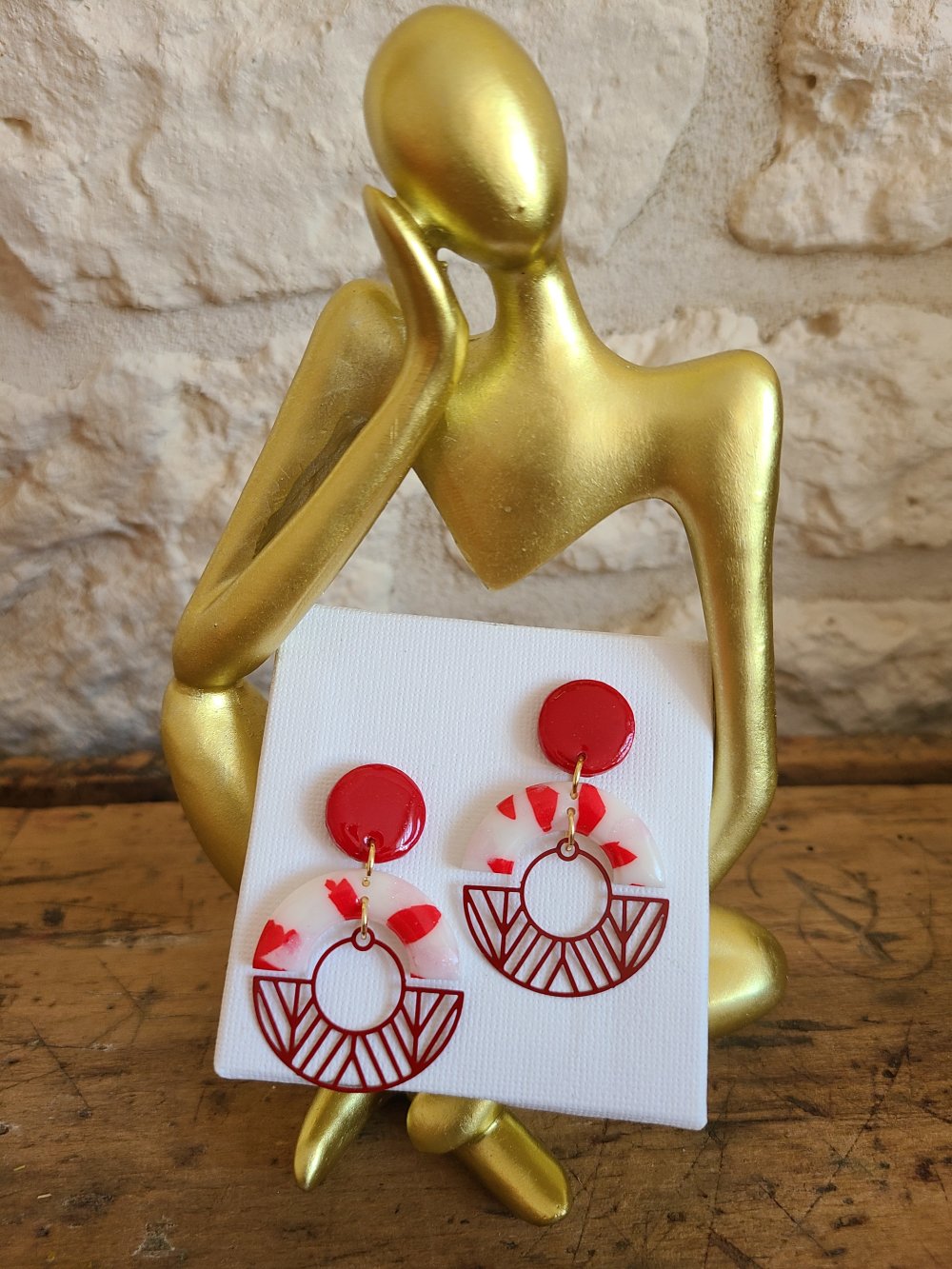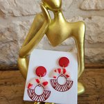 Ces boucles faites à la main en pâte polymère allient la chaleur éclatante du rouge à la douceur nacrée du blanc avec de petites touches de rose pailleté . Une partie géométrique , métal ,ajourée et un arc en pâte polymère évoquant le rayonnement du soleil à son zénith . Légères , modernes et pleines de caractère , elles apportent une touche d' éclat à toutes vos tenues .