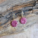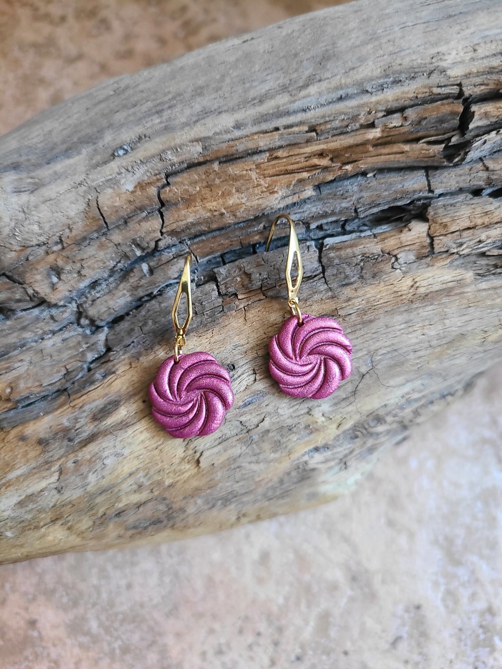 Ces boucles d' oreille faites à la main en pâte polymère formées d' un pendentif circulaire en forme de spirale circulaire , aux reflets framboise métallisés . Suspendu à un crochet ( or ou argent ) qui apporte une touche d' élégance moderne .
