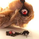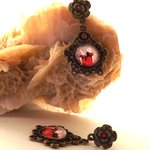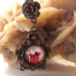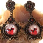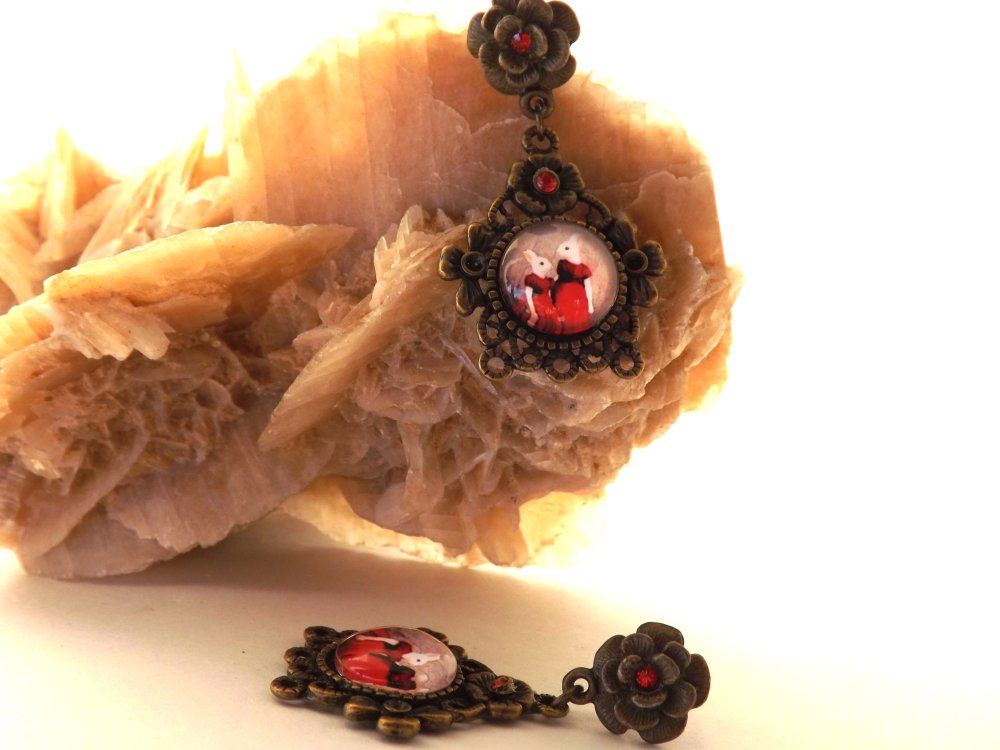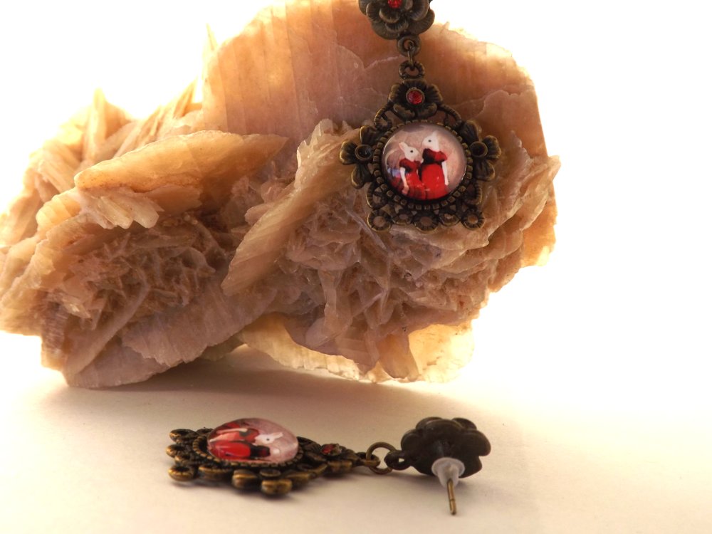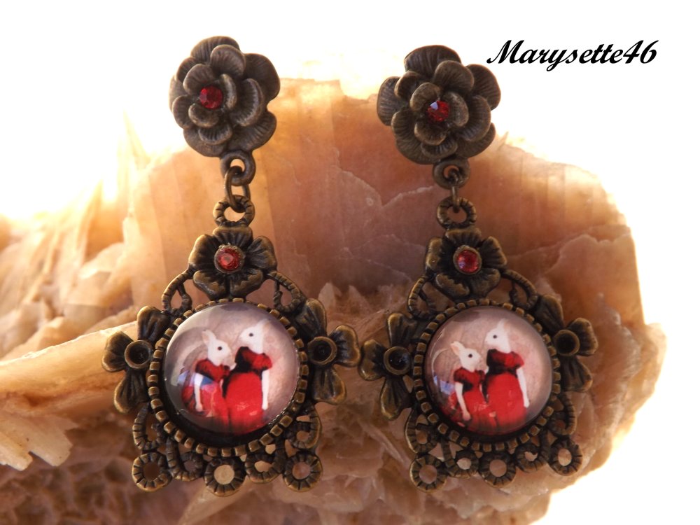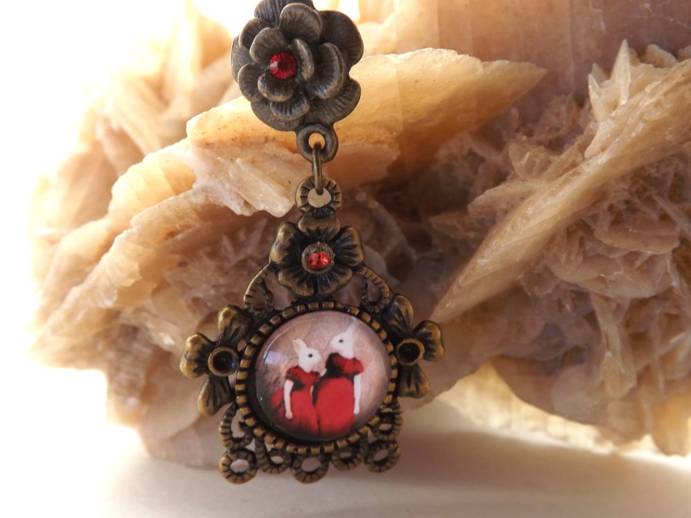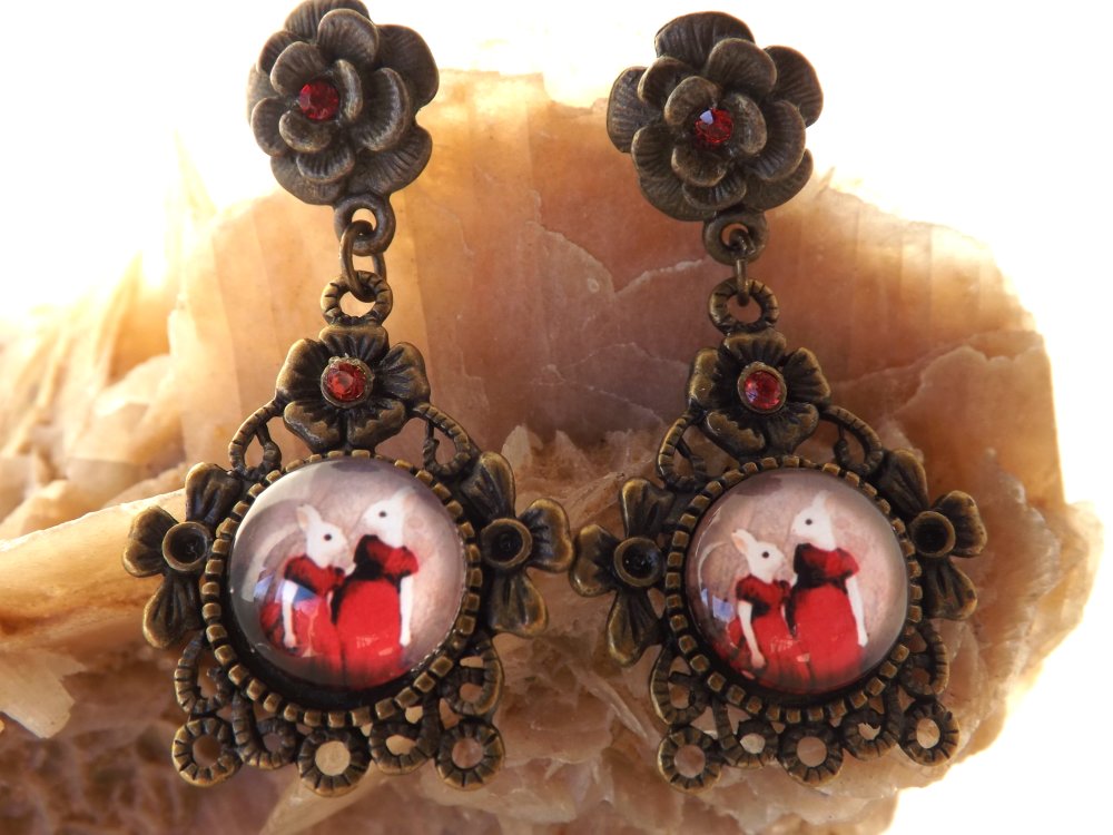 Boucles d'oreilles puces au cabochon dôme "aux deux lapines en robe rouge" rond de 12 mm sur un support couleur bronze de 29 x 28 mm aux strass couleur rouge de 2 mm.