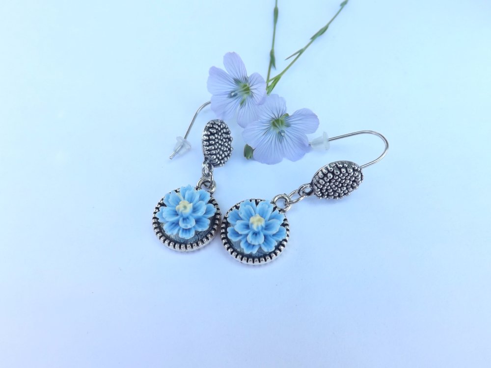 Délicates boucles d'oreilles en métal argenté aux crochets fantaisie de 22 x 10 mm avec leur cabochon en résine d'une fleur bleue en relief.