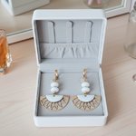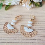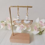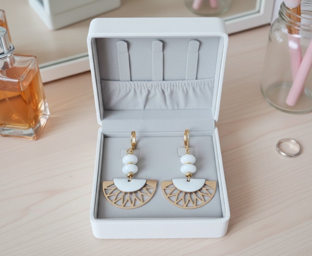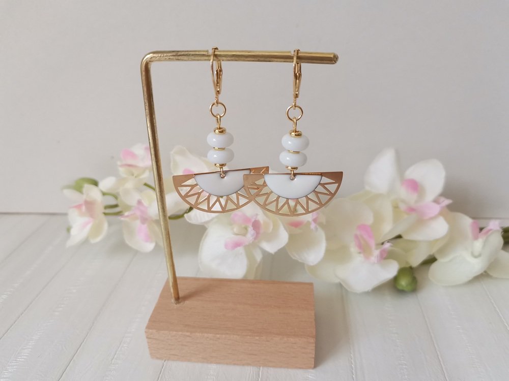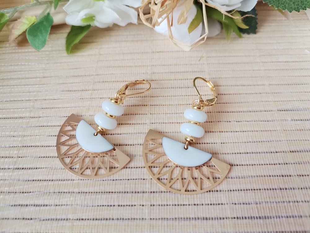 Boucles d'oreilles en acier inoxydable de couleur dorée (pendentif doré éventail, dormeuse à levier, tige et anneaux) avec perles en verre rondelles blanches, pendentif éventail acier inoxydable de couleur doré et sequin demi lune blanc