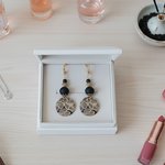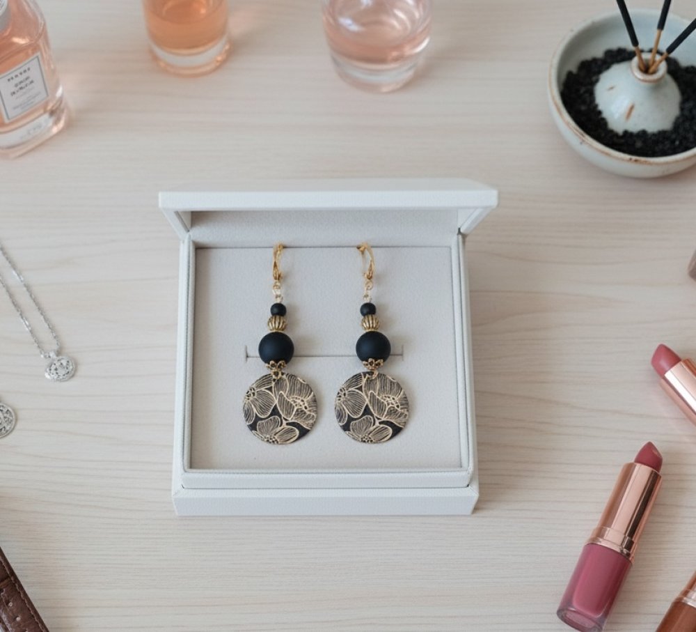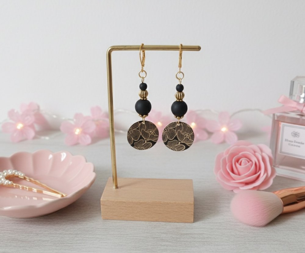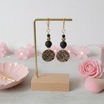 Boucles d'oreilles en acier inoxydable (dormeuses à levier, tige et anneaux) de couleur doré avec perles en verre 10 et 4 mm de couleur noire et pendentif imprimé