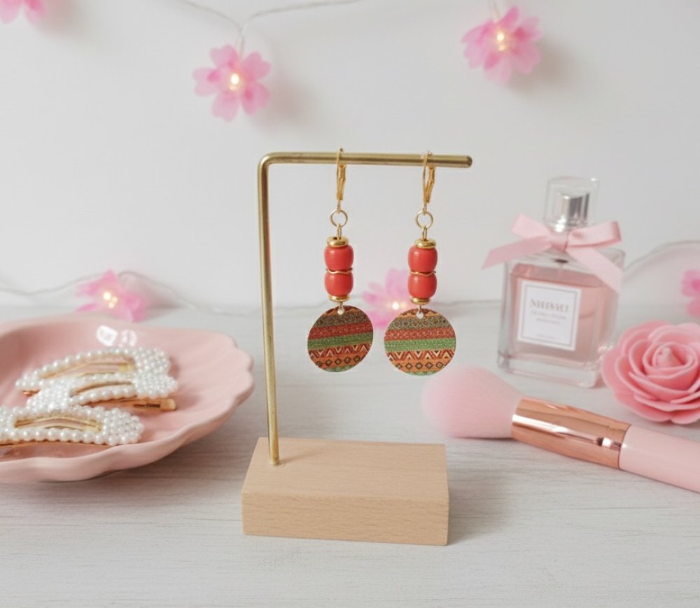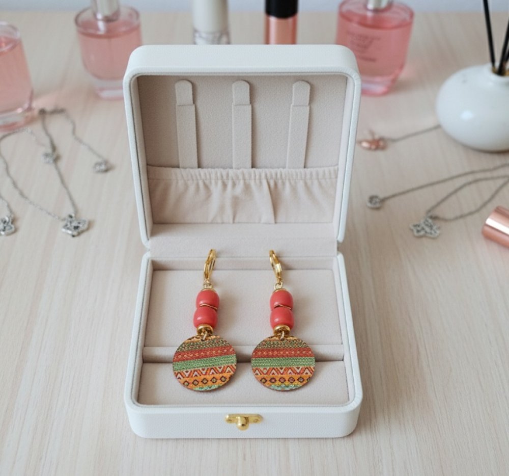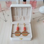 Boucles d'oreilles en acier inoxydable (dormeuses à levier, tige et anneaux) de couleur doré avec perles en verre colonne de 8 mm de couleur corail et pendentif imprimé