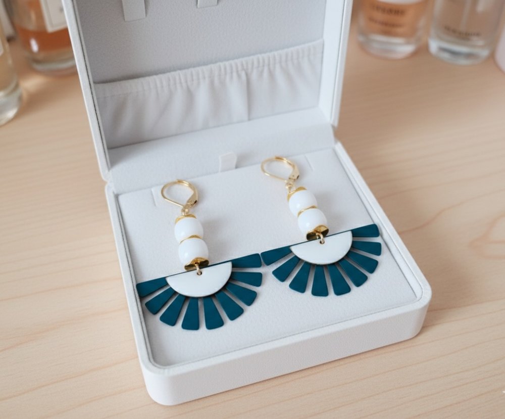 Boucles d'oreilles en acier inoxydable de couleur dorée (dormeuse à levier, tige et anneaux) avec perles en verre colonne blanche, pendentif éventail fer de couleur turquoise et sequin demi lune blanc