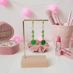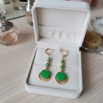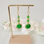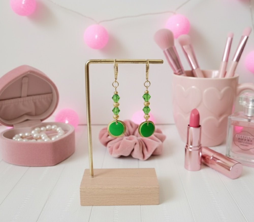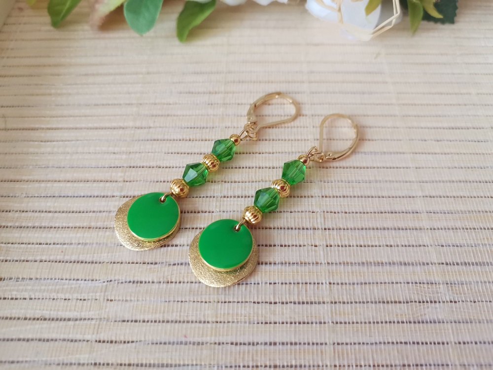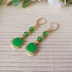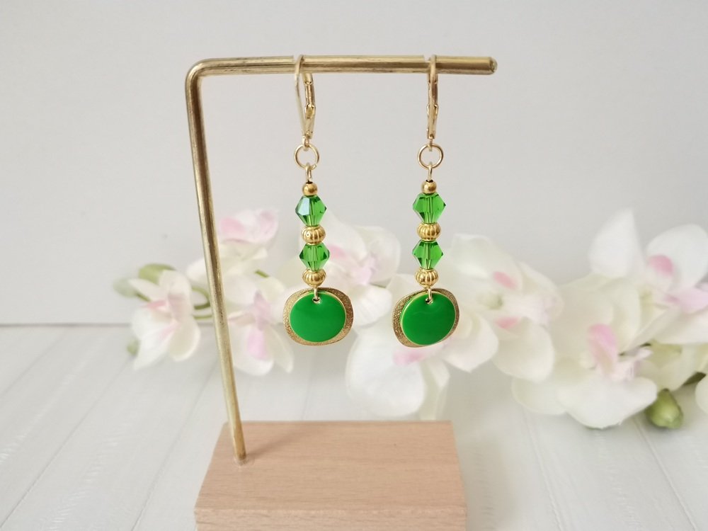 Boucles d'oreilles en acier inoxydable de couleur doré (dormeuse à levier, tige et anneaux) avec perles en verre toupie de 5 mm et pendentif métal doré ondulé et sequin émail vert