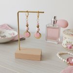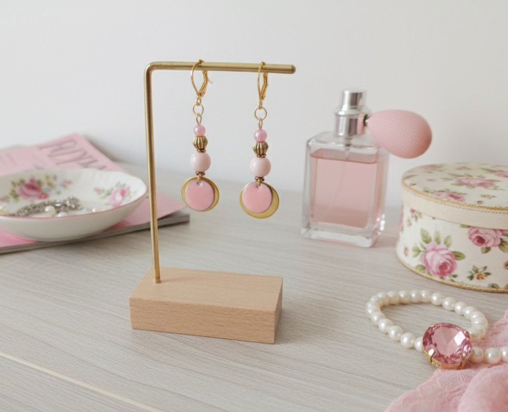 Boucles d'oreilles en acier inoxydable (dormeuses à levier, tige et anneaux) de couleur doré avec perles en verre de 8 mm de couleur rose, pendentif métal doré et sequin émail de 12 mm