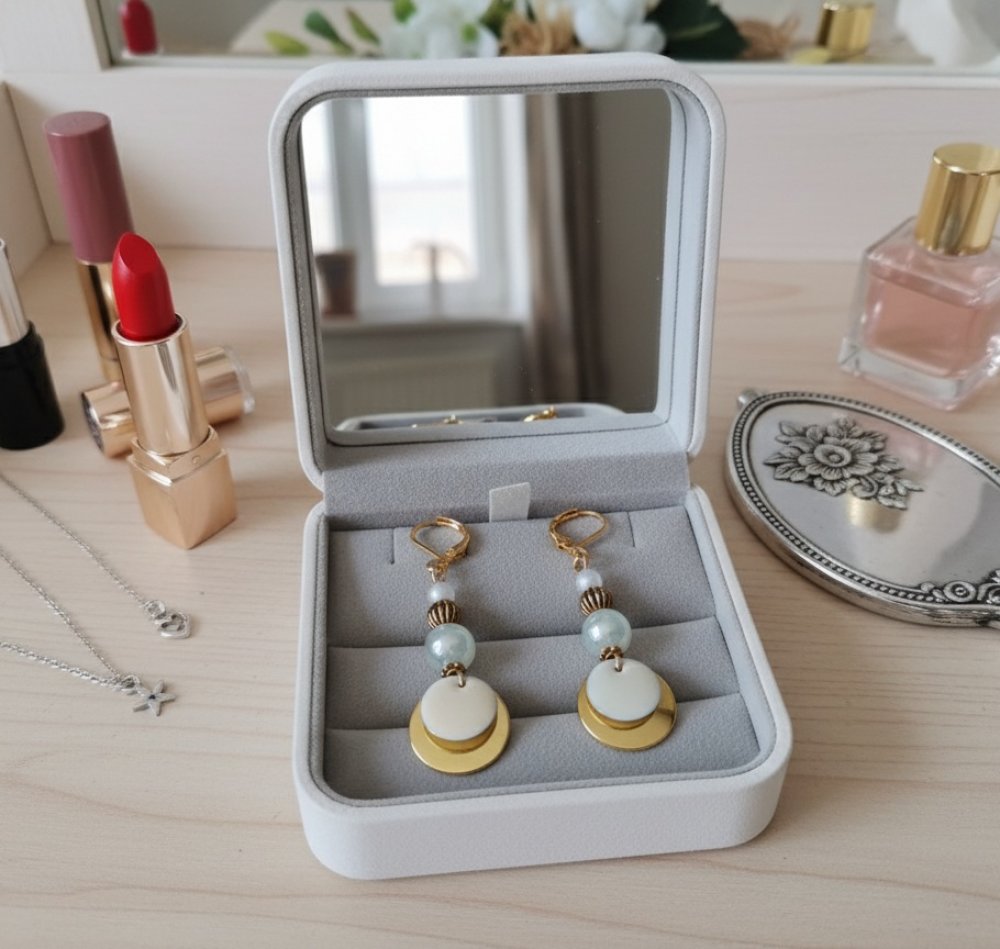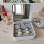 Boucles d'oreilles en acier inoxydable (dormeuses à levier, tige et anneaux) de couleur doré avec perles en verre de 8 mm de couleur ivoire, pendentif métal doré et sequin émail de 12 mm